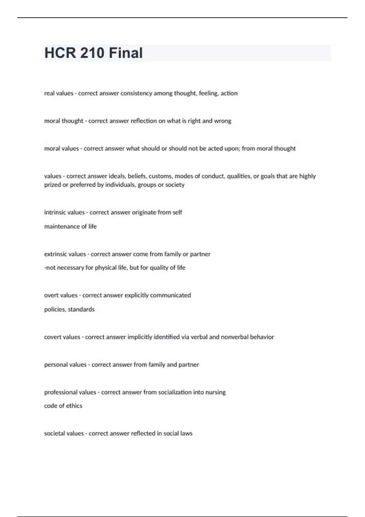 HCR 210 Arizona State University -HCR 210 Final questions well answered real values - correct answer consistency among thought, feeling, action moral thought - correct answer reflection on what is right and wrong moral values - correct answer what should or should not be acted upon; from moral thought values - correct answer ideals, beliefs, customs, modes of conduct, qualities, or goals that are highly prized or preferred by individuals, groups or society intrinsic values - correct answer originate from self maintenance of life extrinsic values - correct answer come from family or partner -not necessary for physical life, but for quality of life overt values - correct answer explicitly communicated policies, standards covert values - correct answer implicitly identified via verbal and nonverbal behavior personal values - correct answer from family and partner professional values - correct answer from socialization into nursing code of ethics societal values - correct answer reflected in social laws