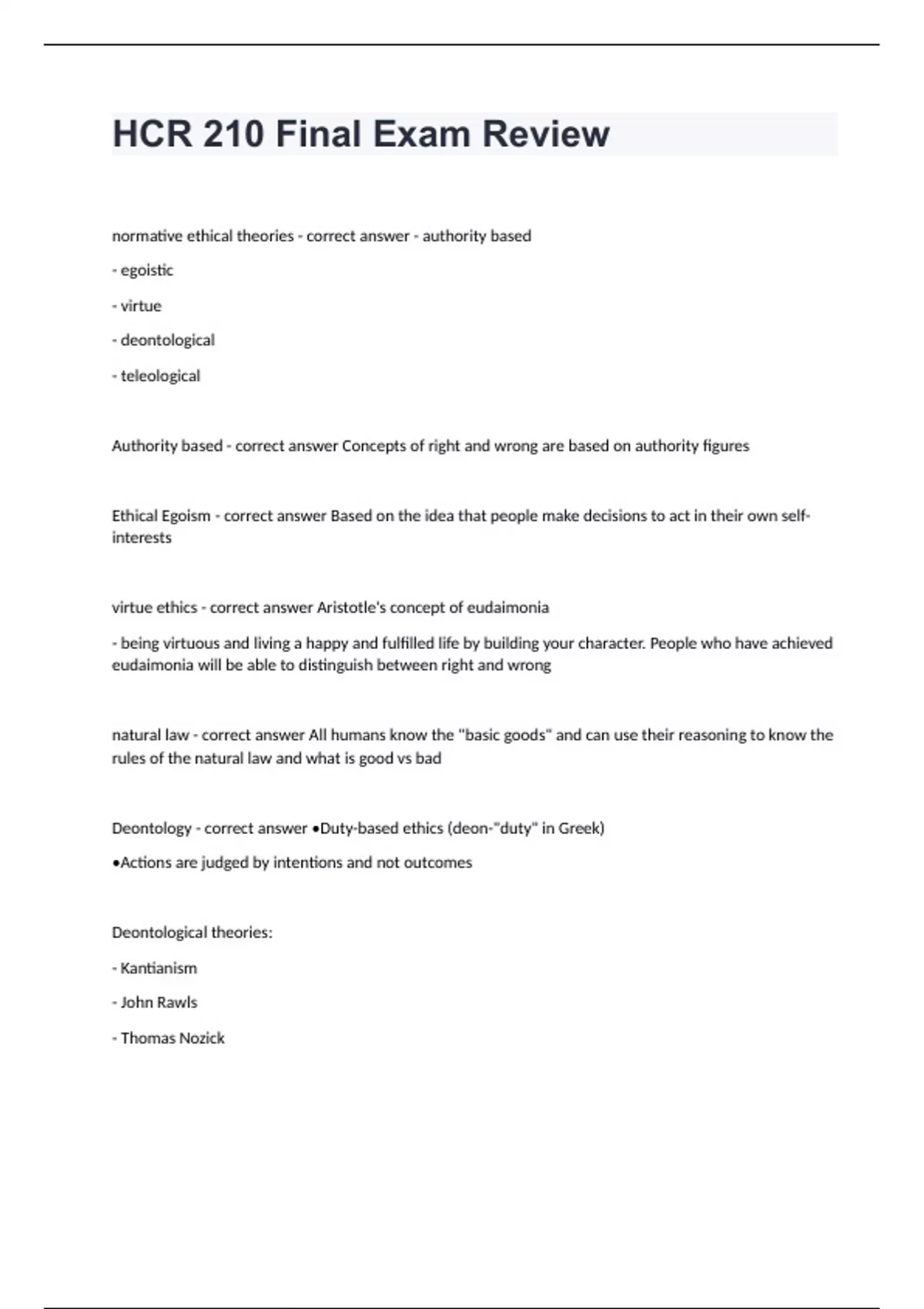 HCR 210 Arizona State University -HCR 210 Final Exam Review already passednormative ethical theories - correct answer - authority based - egoistic - virtue - deontological - teleological Authority based - correct answer Concepts of right and wrong are based on authority figures Ethical Egoism - correct answer Based on the idea that people make decisions to act in their own self-interests virtue ethics - correct answer Aristotle's concept of eudaimonia - being virtuous and living a happy and fulfilled life by building your character. People who have achieved eudaimonia will be able to distinguish between right and wrong natural law - correct answer All humans know the "basic goods" and can use their reasoning to know the rules of the natural law and what is good vs bad Deontology - correct answer •Duty-based ethics (deon-"duty" in Greek) •Actions are judged by intentions and not outcomes Deontological theories: - Kantianism - John Rawls - Thomas Nozick