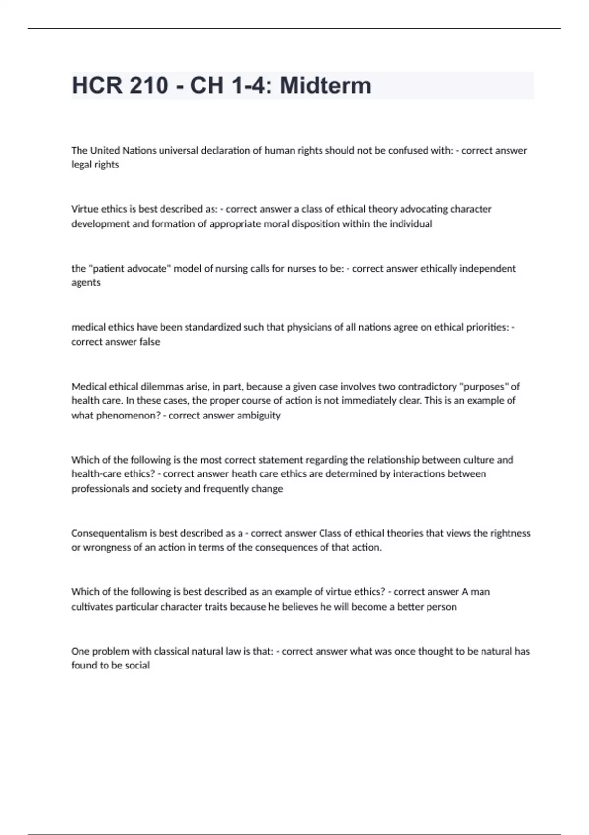 HCR 210 Arizona State University -HCR 210 - CH 1-4: Midterm questions with answersThe United Nations universal declaration of human rights should not be confused with: - correct answer legal rights Virtue ethics is best described as: - correct answer a class of ethical theory advocating character development and formation of appropriate moral disposition within the individual the "patient advocate" model of nursing calls for nurses to be: - correct answer ethically independent agents medical ethics have been standardized such that physicians of all nations agree on ethical priorities: - correct answer false Medical ethical dilemmas arise, in part, because a given case involves two contradictory "purposes" of health care. In these cases, the proper course of action is not immediately clear. This is an example of what phenomenon? - correct answer ambiguity Which of the following is the most correct statement regarding the relationship between culture and health-care ethics? - correct answer heath care ethics are determined by interactions between professionals and society and frequently change Consequentalism is best described as a - correct answer Class of ethical theories that views the rightness or wrongness of an action in terms of the consequences of that action. Which of the following is best described as an example of virtue ethics? - correct answer A man cultivates particular character traits because he believes he will become a better person One problem with classical natural law is that: - correct answer what was once thought to be natural has found to be social