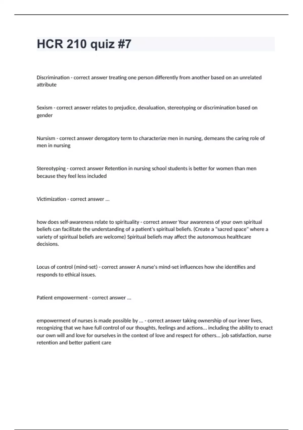 HCR 210 quiz #7Discrimination - correct answer treating one person differently from another based on an unrelated attribute Sexism - correct answer relates to prejudice, devaluation, stereotyping or discrimination based on gender Nursism - correct answer derogatory term to characterize men in nursing, demeans the caring role of men in nursing Stereotyping - correct answer Retention in nursing school students is better for women than men because they feel less included Victimization - correct answer ... how does self-awareness relate to spirituality - correct answer Your awareness of your own spiritual beliefs can facilitate the understanding of a patient's spiritual beliefs. (Create a "sacred space" where a variety of spiritual beliefs are welcome) Spiritual beliefs may affect the autonomous healthcare decisions. Locus of control (mind-set) - correct answer A nurse's mind-set influences how she identifies and responds to ethical issues. Patient empowerment - correct answer ...