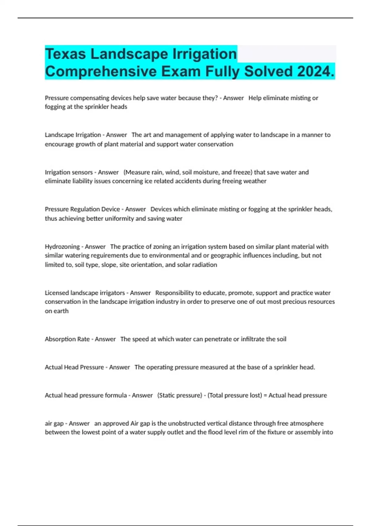 Pressure compensating devices help save water because they? - Answer Help eliminate misting or fogging at the sprinkler heads Landscape Irrigation - Answer The art and management of applying water to landscape in a manner to encourage growth of plant material and support water conservation Irrigation sensors - Answer (Measure rain, wind, soil moisture, and freeze) that save water and eliminate liability issues concerning ice related accidents during freeing weather Pressure Regulation Device - Answer Devices which eliminate misting or fogging at the sprinkler heads, thus achieving better uniformity and saving water Hydrozoning - Answer The practice of zoning an irrigation system based on similar plant material with similar watering reguirements due to environmental and or geographic influences including, but not limited to, soil type, slope, site orientation, and solar radiation Licensed landscape irrigators - Answer Responsibility to educate, promote, support and practice water conservation in the landscape irrigation industry in order to preserve one of out most precious resources on earth Absorption Rate - Answer The speed at which water can penetrate or infiltrate the soil Actual Head Pressure - Answer The operating pressure measured at the base of a sprinkler head. Actual head pressure formula - Answer (Static pressure) - (Total pressure lost) = Actual head pressure air gap - Answer an approved Air gap is the unobstructed vertical distance through free atmosphere between the lowest point of a water supply outlet and the flood level rim of the fixture or assembly into