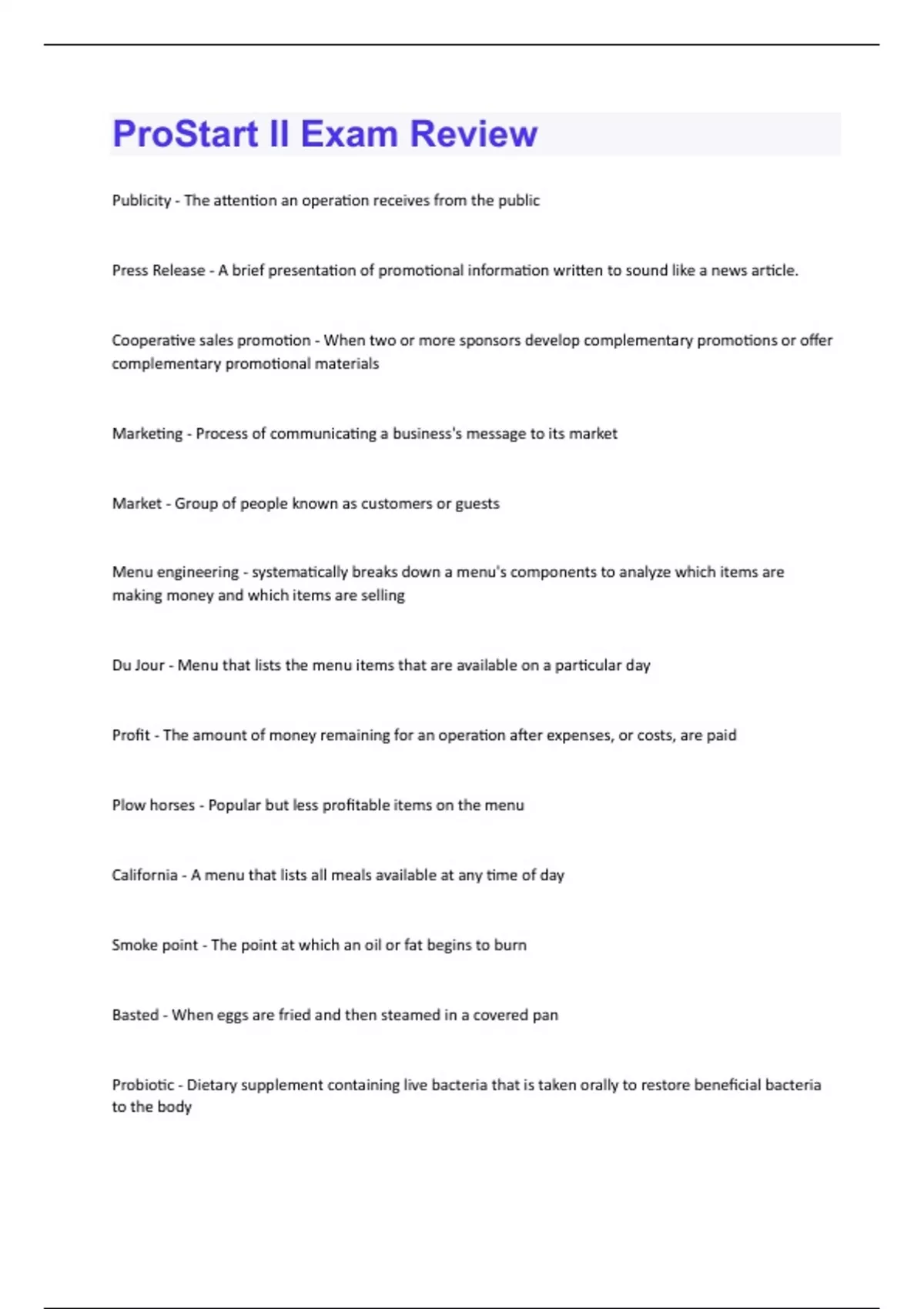 Publicity - The attention an operation receives from the public Press Release - A brief presentation of promotional information written to sound like a news article. Cooperative sales promotion - When two or more sponsors develop complementary promotions or offer complementary promotional materials Marketing - Process of communicating a business's message to its market Market - Group of people known as customers or guests Menu engineering - systematically breaks down a menu's components to analyze which items are making money and which items are selling Du Jour - Menu that lists the menu items that are available on a particular day Profit - The amount of money remaining for an operation after expenses, or costs, are paid Plow horses - Popular but less profitable items on the menu California - A menu that lists all meals available at any time of day Smoke point - The point at which an oil or fat begins to burn Basted - When eggs are fried and then steamed in a covered pan Probiotic - Dietary supplement containing live bacteria that is taken orally to restore beneficial bacteria to the bodyLactose intolerance - Common digestive issue that causes a negative reaction to many cultured dairy products, not just milk Pasteurization - When milk it heated to kill microorganisms that cause spoilage and disease without affecting its nutritional value Pancakes - Made with a milk-egg batter that is poured and cooked on a griddle in round cakes American - Most common service in hotels and restaurants in the United States Hash - Mixture of chopped meat, potatoes, and onions Grits - Similar to polenta Hot cereal - Categories include whole, cracked or flaked grains and granular grains Ethylene Gas - Causes fruits to ripen Enzymatic browning - Occurs when the oxygen in the air comes in contact with the flesh of cut fruit Acids (in terms of fruit) - Helps retain structure Compote - A sauce made by simmering dried fruits, such as apricots, currants, and raisins. Fruit - An organ that develops from the ovary of a flowering plant and contains one or more seeds. Root - Vegetables that are rich in sugars, starches, vitamins, and mineralsSeed - Vegetables including peas and corn Dicing - Cutting a product into cubes with a chef's knife Mesclun mix - A seed blend that includes a variety of leafy lettuce and other greens. Glazing - A finishing technique that gives vegetables a glossy appearance by adding a small amount of honey, sugar, or maple syrup to the vegetable to coat it and give it a sheen as the vegetable reheats. Gnocchi - Small potato dumplings served in Italian cuisine. Milling process - When the germ, bran, and hull of the grain are removed or polished. Solanine - A harmful, bitter-tasting substance that appears as a greenish color on potatoes that are exposed to light. Single-stage - technique that takes potatoes directly from the raw state to the finished state using one cooking method Pilaf - A technique for cooking grains in which the food preparer sautés the grain briefly in oil or butter and then simmers it in stock or water with various seasonings. Point of sale (POS) - system where most operations run historical sales and production reports from Full-line supplier - a one-stop shop that provides equipment, food, and supplies to the restaurant and foodservice industry Profit and loss report - Compiles sales and cost information for a specific period of time Labor - Total cost associated with staff members employed by an operationRevenue - Income from sales before expenses, or costs, are subtracted Recipe yield - number of portions that a recipe makes Food production chart - Form that shows how much product should be produced by the kitchen during a given meal period. Inventory - Food product in storage and can be expressed in terms of units, dollar values, or both Recipe cost card - Tool used to calculate the standard portion cost for a menu item. Actual purchase price - Method of calculating closing inventory by multiplying the number of units of each item by the price actually paid for each unit Employee turnover - Number of employees hired to fill one position in a year's time Crew Schedule - Chart that shows employees' names and the days and times they are supposed to work. Variable cost - Cost that will change based on the amount of sales at the restaurant and foodservice operation Master schedule - Template showing the number of people needed in each position to run the restaurant for a given time period. Business volume - Amount of sales an operation is doing for a given time period. Franchisees - Independent business owners who buy the right to use a company's name, products, and logoLeaders - Sales mix items that sell well Reorder point - The inventory level that signals the need to place a new order Pilfering - The illegal taking of inventory items by employees for their personal use. Make-or-buy Analysis - shows the cost of using convenience food product compared to the cost of making the item from scratch Job description - A document that defines the work involved in a particular assignment or position. Onboarding - the process a company uses to integrate new employees into the organization, improving employee retention rates Cross-training - an employee learns more than one job Exempt - Positions not covered under the Fair Labor Standards Act Sustainability - Practice of meeting current resource needs without compromising the ability to accommodate future needs Green - A building that has been designed, built, renovated, or reused so that the structure conserves energy, uses resources more efficiently, and reduces the overall impact on the environment Recycling - Convert waste into reusable material. Aquaculture - Production of seafood under controlled conditions. Renewable Energy - a source of energy that do not rely on a finite supply, directly emit greenhouse gases, or contribute to air pollutionSimple - Carbohydrates that contain one or two sugars Insoluble - Fiber that does no