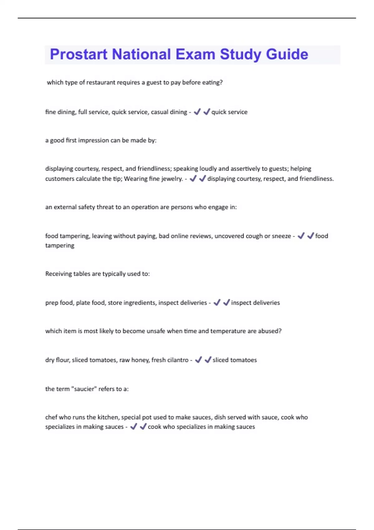 which type of restaurant requires a guest to pay before eating? fine dining, full service, quick service, casual dining - quick service a good first impression can be made by: displaying courtesy, respect, and friendliness; speaking loudly and assertively to guests; helping customers calculate the tip; Wearing fine jewelry. - displaying courtesy, respect, and friendliness. an external safety threat to an operation are persons who engage in: food tampering, leaving without paying, bad online reviews, uncovered cough or sneeze - food tampering Receiving tables are typically used to: prep food, plate food, store ingredients, inspect deliveries - inspect deliveries which item is most likely to become unsafe when time and temperature are abused? dry flour, sliced tomatoes, raw honey, fresh cilantro - sliced tomatoes the term "saucier" refers to a: chef who runs the kitchen, special pot used to make sauces, dish served with sauce, cook who specializes in making sauces - cook who specializes in making saucesthe factors that affect a sanitizer's effectiveness are: temperature, concentration, and altitude; contact time, temperature, and concentration; turbidity, temperature, and contact time; contact time, altitude, and temperature. - contact time, temperature, and concentration body language and gestures are which type of communication? nonverbal, spoken, verbal, written - nonverbal An example of cookware with two handles used for boiling and simmering foods is the: stock pot, fish poacher, crepe pan, thermocouple - stock pot a foodservice organization that works to hire individuals with different backgrounds, religions, and experiences appreciates: prejudice, diversity, bias, stereotypes - diversity after four hours of continuously making sandwiches, what actions should the food handler perform to the work surface? clean; clean and sanitize; wipe down; throw it out - clean and sanitize What is it called when several people connect for the purpose of building relationships that may result in career advancement? networking, training, working, volunteering - networking bacteria grow especially fast in the temperature range of:0°F (-18°C) to 212°F (100°C). 41°F (5°C) to 141°F (61°C). 41°F (5°C) to 70°F (21°C). 70°F (21°C) to 125°F (52°C). - 41°F (5°C) to 141°F (61°C). what is a food safety management system typically designed to prevent? food waste, food theft, foodborne illness, high food costs - foodborne illness the single most important part of personal hygiene for a food handler is: removing jewelry, restraining hair, washing hands, wearing a clean uniform - washing hands
