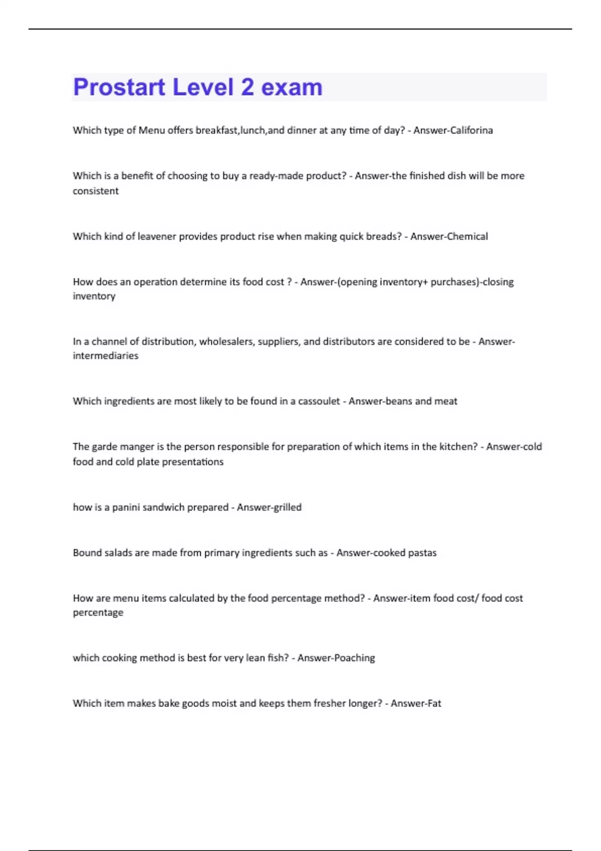 Which type of Menu offers breakfast,lunch,and dinner at any time of day? - Answer-Califorina Which is a benefit of choosing to buy a ready-made product? - Answer-the finished dish will be more consistent Which kind of leavener provides product rise when making quick breads? - Answer-Chemical How does an operation determine its food cost ? - Answer-(opening inventory+ purchases)-closing inventory In a channel of distribution, wholesalers, suppliers, and distributors are considered to be - Answerintermediaries Which ingredients are most likely to be found in a cassoulet - Answer-beans and meat The garde manger is the person responsible for preparation of which items in the kitchen? - Answer-cold food and cold plate presentations how is a panini sandwich prepared - Answer-grilled Bound salads are made from primary ingredients such as - Answer-cooked pastas How are menu items calculated by the food percentage method? - Answer-item food cost/ food cost percentage which cooking method is best for very lean fish? - Answer-Poaching Which item makes bake goods moist and keeps them fresher longer? - Answer-FatThe process of breaking down organic material to form fertilizer is known as - Answer-composing A small amount of potato salad would be appropriate as which type of salad? - Answer-Accompaniment What is the formula for increasing or decreasing a recipe yield? - Answer-(Desired yield / original yield) x Each ingredient amount What traditional form of breakfast potatoes are shredded or chopped raw before being cooked? - Answer-Hashed brown Why does the cost of food sold NOT equal the cost of actual sold food? - Answer-Allowances need to be made for waste, employee meals, and promotions The four basic parts of a salad are - Answer-base, body, garnish, and dressing A profit and loss report is a compilation of which two items? - Answer-Sales and costs Which option shows the correct progression of milk fat content from lowest to highest? - Answer-Skim, whole, condensed, half and half, heavy cream An operation that wants to buy food produced by local sources should.....? - Answer-Start small and look for logical opportunities Which distribution channel does a farmer represent? - Answer-Primary Materials that are desirable foe composting include - Answer-Coffee grounds and paper napkins Offering 2- for -1 appetizers every Friday between 3-00 p.m. and 5:00 p.m. is considered which type of market communication - Answer-Sales promotionHow is the biscuit method for making quick breads different from other methods? - Answer-A fat is rubbed or cut into the flour untill he mixture is mealy or bumpy in appearance Which raw, enzyme- containing fruit dissolves gelatin? - Answer-pineapple Chapati, naan, and paratha are names for which items used in a cuisine from india ? - Answer-Flatbreads The method of roasting meat on skewers over fire, which is very popular in Brazil, is referred to as , - Answer-Churrasco Cholesterol can be found in - Answer-Milk Which food is characteristic of southern cuisine? - Answer-Jambalaya The goal of target marketing is to - Answer-Make a focused appeal to a distinct group of customers If projected monthly food cost are 15,000 and food sales are 45,000 the food cost percentage is - Answer-33 Which product is legally protected from imitation by the Spanish government - Answer-Jamon iberico The main purpose of bread in a sandwich is the provide - Answer-bulk Yeast beds are the most often made using which two primary methods? - Answer-Straight-dough and sponge What is mole - Answer-Slow-cooked sauce with complex flavor In Jamaica, meat is seasoned with a spicy dry rub called? - Answer-Curry powdeerWhich document is useful for determining costs that have gotten out of line, judging the operations efficiency, making basic management decisions? - Answer-Profit -and lose report Iron content increases when cooking meat in an iron pan - Answer-tomato Which type of forecast uses the number of expecting guests to determine purchasing needs? - Answercustomer count The primary purpose of SWOT analysis is to..? - Answer-Understand a business's current state and opportunities The new england boiled dinner includes.....? - Answer-Corned beef brisket, potatoes, and cabbage A squab is a young...? - Answer-pigeon What should a buyer use to help ensure that products meet quality standards? - Answer-Specifications Which organization is most likely to use a formal purchasing process? - Answer-Casual-dining chain with units in four states Emailing information to college students about the coffee shop on campus is an example of - AnswerDirect marketing What are the three main functions of icing? - Answer-Provide a protective coating, contribute flavor and richness, and improve appearance The question that should be considered when conducting a make -or-buy analysis is , ''does the.....?''' - Answer-staff have the skills to make this product consistently A good source of protein is - Answer-shell eggsWhen receiving fresh shellfisjh, they must be - Answer-alive The most appropriate salad green to match with a vinaigrette dressing made from walnut oil and balsamic vinegar is - Answer-arugula The process of communicating a business's message to its market is called - Answer-purchasing A famous dish based on rice, olive oil, and saffron cooked in one pot is called - Answer-paella Which kind of chicken meat is low in calories and fat content? - Answer-white The formula for calculating bakers percentage is - Answer-weight of ingredients ÷(weight of flour ×100%) Which quality grade for beef,veal,and lamb is highest - Answer-prime Sustainability can be defined as practices that - Answer-meet current resources needs,such as water and natural gas, without compromising the ability to meet future needs A delivery of poultry should be rejected if the poultry has - Answer-stickiness under the wings Which option presents the correct order,from top to bottom, for storing the followinv items in a cooler - Answer-Ready t