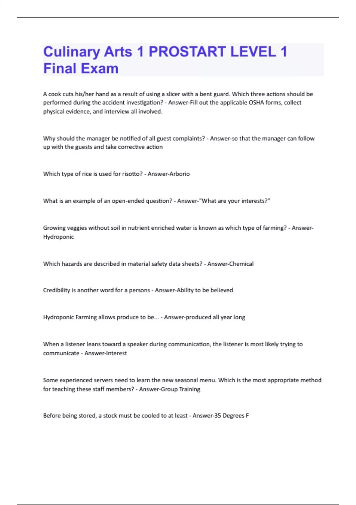 A cook cuts his/her hand as a result of using a slicer with a bent guard. Which three actions should be performed during the accident investigation? - Answer-Fill out the applicable OSHA forms, collect physical evidence, and interview all involved. Why should the manager be notified of all guest complaints? - Answer-so that the manager can follow up with the guests and take corrective action Which type of rice is used for risotto? - Answer-Arborio What is an example of an open-ended question? - Answer-"What are your interests?" Growing veggies without soil in nutrient enriched water is known as which type of farming? - AnswerHydroponic Which hazards are described in material safety data sheets? - Answer-Chemical Credibility is another word for a persons - Answer-Ability to be believed Hydroponic Farming allows produce to be... - Answer-produced all year long When a listener leans toward a speaker during communication, the listener is most likely trying to communicate - Answer-Interest Some experienced servers need to learn the new seasonal menu. Which is the most appropriate method for teaching these staff members? - Answer-Group Training Before being stored, a stock must be cooled to at least - Answer-35 Degrees FThe three forms of food contamination hazards are: - Answer-Biological, chemical, and physical Informing employees of job safety and health protection is the responsibility of - Answer-the Employer What is the decimal equivalent of 1/8? - Answer-0.125 The fraction that equals 0.6667 is - Answer-2/3 In order to explain the expectations of a job to a new employee, a manager should use - Answer-Planned messages TCS food refers to food that needs which component of safety? - Answer-Time / Temp control The staff member who is responsible for service throughout the dining room is the - Answer-Headwaiter Bacteria grow very fast at: - Answer-70-125 F A rice with an aromatic nutty flavor that is often used for rice pudding and pilafs is called - AnswerJasmine Which type of oven has a fan that circulates heated air around the food that it cooks? - AnswerConvection A stereotype is defined as a - Answer-Generalization made by an individual about a particular group that regards all the members as the same. Poaching is an example of cooking with which type of heat? - Answer-Moist To ensure food safety, food handlers should focus on controlling - Answer-Time and TemperatureA cook making potato salad for a party of 20, but the recipe serves 8. What is the conversion factor for making the desired yield? - Answer-2.5 Which sauce base acts as a thicker and is made of equal parts cooked flour and fat? - Answer-Roux On a job application, which answer is appropriate when asked about desired compensation? - AnswerOpen A recipe calls for 10 lbs of trimmed cauliflower. if the yield is 55%, how many pounds of cauliflower should be ordered? - Answer-18.2 The four ingredients to make fresh pasta are - Answer-Bread flour, olive oil, salt, and eggs A manager notices that an employee is struggling to remember the nightly specials. The manager takes the employee aside during a slow moment to offer a few tricks for memorizing the dishes and to thank the employee for working hard to improve. The manager is practicing which type of communication? - Answer-Interpersonal Poultry must be cooked to what minimum internal temp for at least 15 seconds - Answer-165 F Which piece of equipment is used for straining soups, stocks, and other liquids - Answer-China cap Who is primarily responsible for seating customers in a table-service operation? - Answer-Host Which obstacle to good communication is demonstrated by the fact that the word "mouse" means both a rodent and a computer device? - Answer-Semantics The primary functions of OSHA is to - Answer-Create and enforce safety-related standards in the workplace What is a Sachet d'epices - Answer-Assorted herbs and spices in a cheesecloth bagWhich type of communication allows for immediate feedback - Answer-Interpersonal The sweetness of fruit is due to the presence of which type of sugar? - Answer-Fructose What is the purpose of bain-marie - Answer-Keep food warm What are the five Mother sauces? - Answer-Bechamel, veloute, espagnole, tomato, and hollandaise When referring to "smart" goals, what does the M stand for - Answer-Measurable What are six conditions that pathogens need to grow? - Answer-Food, acidity, time, temp, oxygen, and moisture
