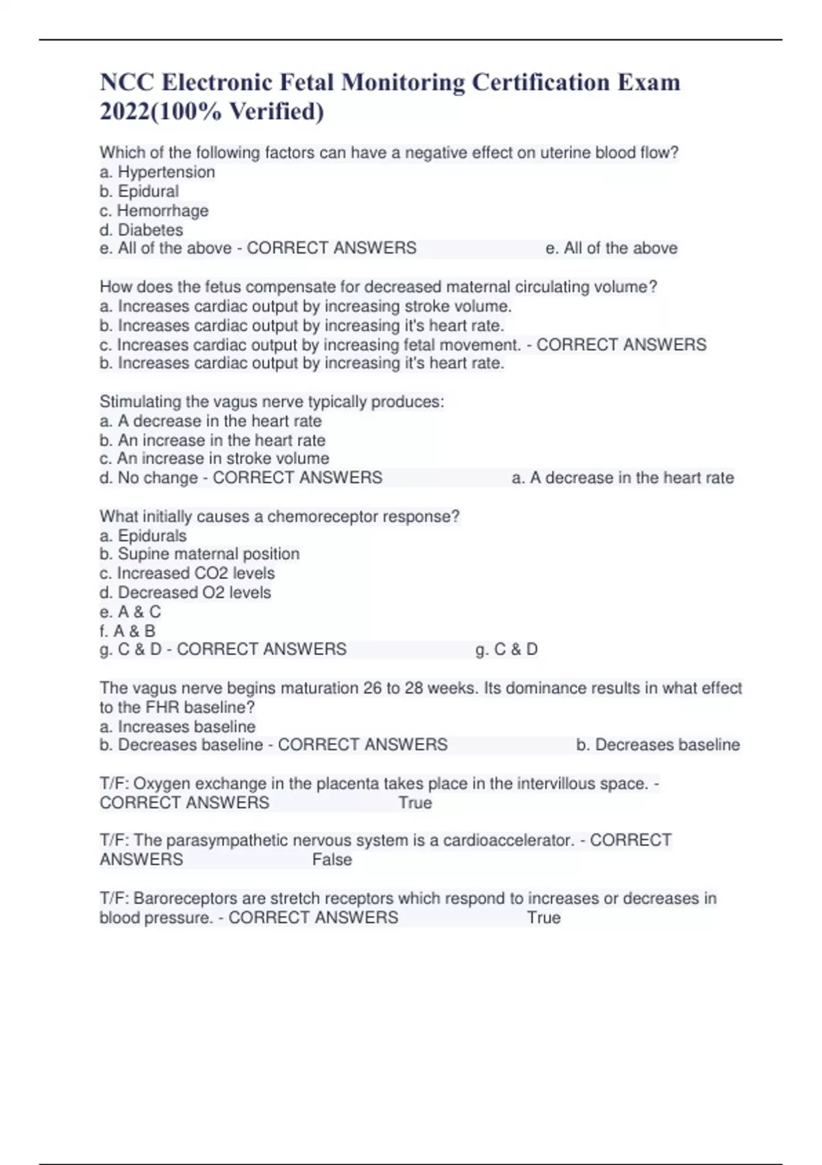 Which of the following factors can have a negative effect on uterine blood flow? a. Hypertension b. Epidural c. Hemorrhage d. Diabetes e. All of the above - CORRECT ANSWERS e. All of the above How does the fetus compensate for decreased maternal circulating volume? a. Increases cardiac output by increasing stroke volume. b. Increases cardiac output by increasing it's heart rate. c. Increases cardiac output by increasing fetal movement. - CORRECT ANSWERS b. Increases cardiac output by increasing it's heart rate. Stimulating the vagus nerve typically produces: a. A decrease in the heart rate b. An increase in the heart rate c. An increase in stroke volume d. No change - CORRECT ANSWERS a. A decrease in the heart rate What initially causes a chemoreceptor response? a. Epidurals b. Supine maternal position c. Increased CO2 levels d. Decreased O2 levels e. A & C f. A & B g. C & D - CORRECT ANSWERS g. C & D The vagus nerve begins maturation 26 to 28 weeks. Its dominance results in what effect to the FHR baseline? a. Increases b