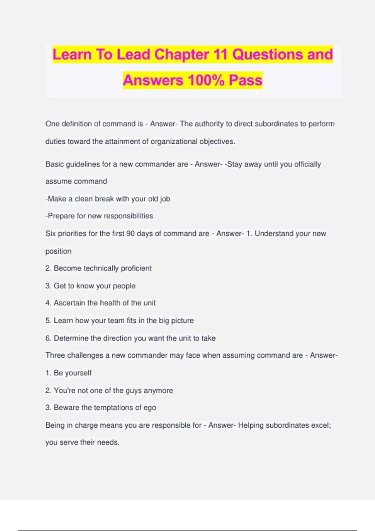 Learn To Lead Chapter 11 Questions and Answers 100% Pass One definition of command is - Answer- The authority to direct subordinates to perform duties toward the attainment of organizational objectives. Basic guidelines for a new commander are - Answer- -Stay away until you officially assume command -Make a clean break with your old job -Prepare for new responsibilities Six priorities for the first 90 days of command are - Answer- 1. Understand your new position 2. Become technically proficient 3. Get to know your people 4. Ascertain the health of the unit 5. Learn how your team fits in the big picture 6. Determine the direction you want the unit to take Three challenges a new commander may face when assuming command are - Answer- 1. Be yourself 2. You're not one of the guys anymore 3. Beware the temptations of ego Being in charge means you are responsible for - Answer- Helping subordinates excel; you serve their needs. Steps included in developing a command intent are - Answer- 1. Review your commander's intent 2. Provide the "why," the context for the mission 3. Address the scope of authority that troops have The three components of a command intent are - Answer- 1. Developing command intent 2. Communicating a command intent 3. Cooperate & imagine an intent Three approaches for communicating command intent are - Answer- 1. A carefully prepared speech or written document 2. Informal discussion/remarks 3. The passage of time.......... The components of a mission statements are - Answer- -An overarching reason for being -Human connection -Logical sequencing -Measurable goals The three steps to developing a mission statement are - Answer- 1. Involve the troops 2. Consider the stakeholders' perspectives 3. Reflect upon questions that get to your inner core Human capital conveys a belief that - Answer- Good people are like gold, and that having good people on your team is more important than having money in the bank. The questions that a good job description must answer are - Answer- 1. Why does this job exist? 2. What does the job accomplish 3. How does this job related to other jobs in th