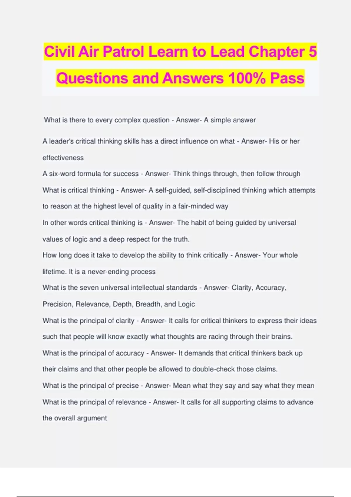 Civil Air Patrol Learn to Lead Chapter 5 Questions and Answers 100% Pass What is there to every complex question - Answer- A simple answer A leader's critical thinking skills has a direct influence on what - Answer- His or her effectiveness A six-word formula for success - Answer- Think things through, then follow through What is critical thinking - Answer- A self-guided, self-disciplined thinking which attempts to reason at the highest level of quality in a fair-minded way In other words critical thinking is - Answer- The habit of being guided by universal values of logic and a deep respect for the truth. How long does it take to develop the ability to think critically - Answer- Your whole lifetime. It is a never-ending process What is the seven universal intellectual standards - Answer- Clarity, Accuracy, Precision, Relevance, Depth, Breadth, and Logic What is the principal of clarity - Answer- It calls for critical thinkers to express their ideas such that people will know exactly what thoughts are racing through their brains. What is the principal of accuracy - Answer- It demands that critical thinkers back up their claims and that other people be allowed to double-check those claims. What is the principal of precise - Answer- Mean what they say and say what they mean What is the principal of relevance - Answer- It calls for all supporting claims to advance the overall argument What is the principal of depth - Answer- The willingness to examine every imaginable complexity or factor bearing on an issue What is the principal of breadth - Answer- Concerns how far across either side he or she is willing to look when considering an issue What is the principal of logic - Answer- When one point s