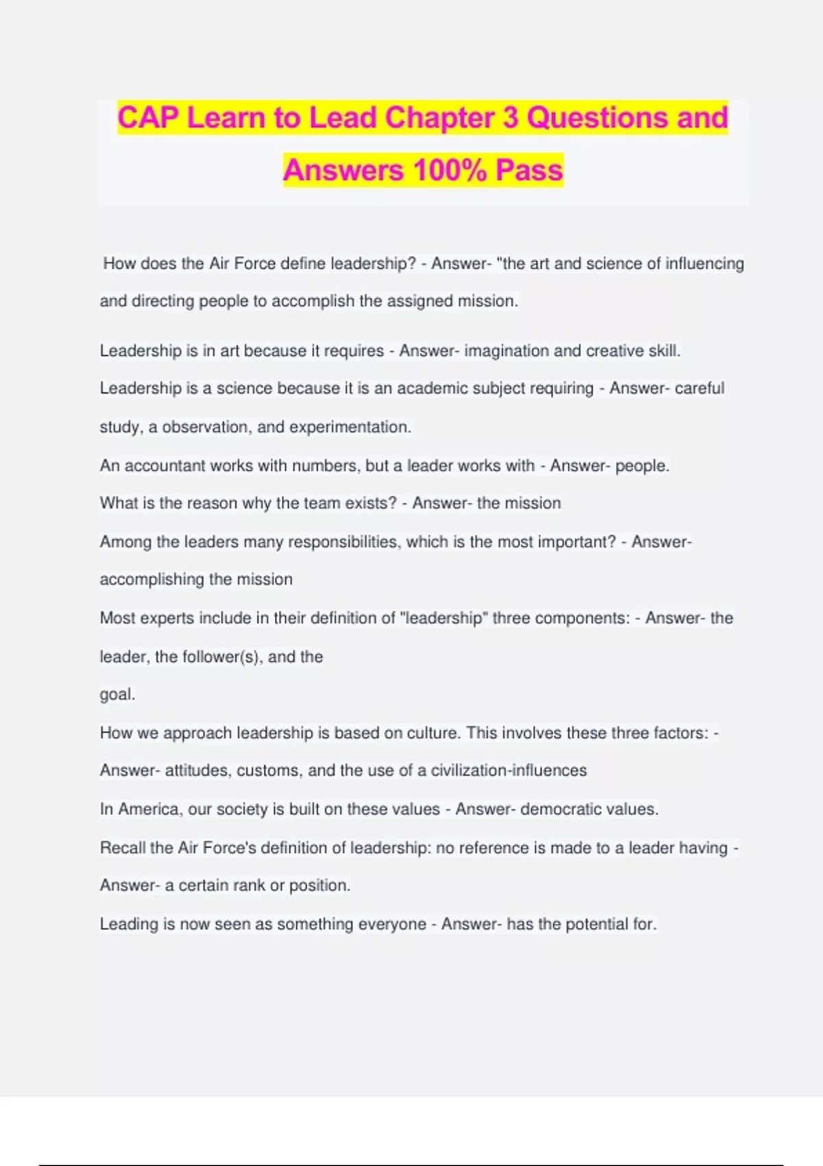 CAP Learn to Lead Chapter 3 Questions and Answers 100% Pass How does the Air Force define leadership? - Answer- "the art and science of influencing and directing people to accomplish the assigned mission. Leadership is in art because it requires - Answer- imagination and creative skill. Leadership is a science because it is an academic subject requiring - Answer- careful study, a observation, and experimentation. An accountant works with numbers, but a leader works with - Answer- people. What is the reason why the team exists? - Answer- the mission Among the leaders many responsibilities, which is the most important? - Answer- accomplishing the mission Most experts include in their definition of "leadership" three components: - Answer- the leader, the follower(s), and the goal. How we approach leadership is based on culture. This involves these three factors: - Answer- attitudes, customs, and the use of a civilization-influences In America, our society is built on these values - Answer- democratic values. Recall the Air Force's definition of leadership: no reference is made to a leader having - Answer- a certain rank or position. Leading is now seen as something everyone - Answer- has the potential for. Complete this statement. Absolute power __________ __________ - Answer- corrupts absolutely. These three strategies are not tools genuine leaders use. - Answer- Threats, coercion, and extortion James Macgregor Burns position is "Bad leadership implies no leadership. I contend that there is nothing neutral about leadership; it is valued as a - Answer- moral necessity." In the everyday sense of the word, "to lead" means to - Answer- bring someone to a new place. Visionary leaders paint this for the whole team. - Answer- an inspiring future picture Seventeen years before Pearl Harbor, Billy Mitchell was warning that Japan could use - Answer- carrier-based airplanes to attack Hawaii. Billy Mitchell's vision called for creating an independent Air Force that would not be - Answer- subject to the Army or Navy Cadets want to have a sense of ownership over their programs. With that freedom comes the responsibility to . - Answer- provide visionary leadership Living in the real world, leaders must - Answer- envision the future A skillful leader understands how to - Answer- issue a challenge. Motivation is more than just cheering, it comes in many forms: - Answer- money, praise, a prestigious position, awards, special privilege. John F. Kennedy challenged America by appealing to the nation and several ways. First he cited - Answer- the great accomplishments of earlier generations John F. Kennedy challenged America by appealing to the nation and several ways. His second challenge cited - Answer- world power Competition is another motivator. People want to do this. - Answer- to win. President Kennedy motivated by a putting this on the line. - Answer- his presidency Most of all President Kennedy motivated by setting - Answer- an audacious goal Cadets' motivate one another all the time-during competitions, on obstacle courses, and whenever they try to build . - Answer- team spirit Leaders with a compelling personality might inspire the team to follow them for the wrong reasons, or worse, motivate them to do something they know - Answer- is wrong A leader will want to take an idea in his or her mind and deposited it - Answer- in the minds of others Leaders who are effective communicators vary their message, doing whatever in it takes to - Answer- reach their audience