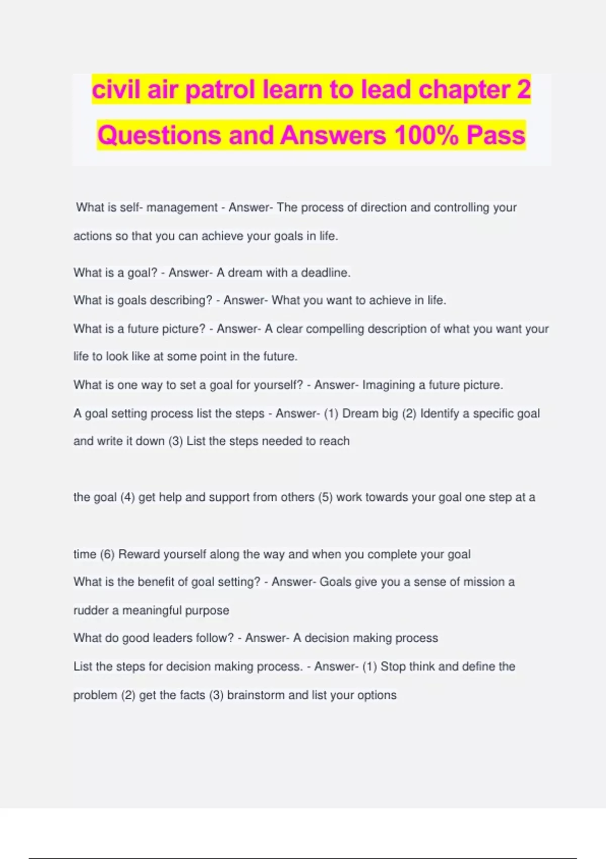 civil air patrol learn to lead chapter 2 Questions and Answers 100% Pass What is self- management - Answer- The process of direction and controlling your actions so that you can achieve your goals in life. What is a goal? - Answer- A dream with a deadline. What is goals describing? - Answer- What you want to achieve in life. What is a future picture? - Answer- A clear compelling description of what you want your life to look like at some point in the future. What is one way to set a goal for yourself? - Answer- Imagining a future picture. A goal setting process list the steps - Answer- (1) Dream big (2) Identify a specific goal and write it down (3) List the steps needed to reach the goal (4) get help and support from others (5) work towards your goal one step at a time (6) Reward yourself along the way and when you complete your goal What is the benefit of goal setting? - Answer- Goals give you a sense of mission a rudder a meaningful purpose What do good leaders follow? - Answer- A decision making process List the steps for decision making process. - Answer- (1) Stop think and define the problem (2) get the facts (3) brainstorm and list your options (4) Weigh your options (5) consider your values (6) decide and act (7) re-evaluate the decision. Define brainstorming. - Answer- A method of generation a large number of creative ideas Define Stakeholders. - Answer- People who have a stake in the solution Define ethical trap - Answer- The solution to the problem turns out to be unethical as a result a secondary ethical problem pops up. Define time management - Answer- The process of organizing and using your time wisely Define efficiency - Answer- How well a leader is making use of their time and other resources Efficient time management tools - Answer- (1) Pay attention (2) co