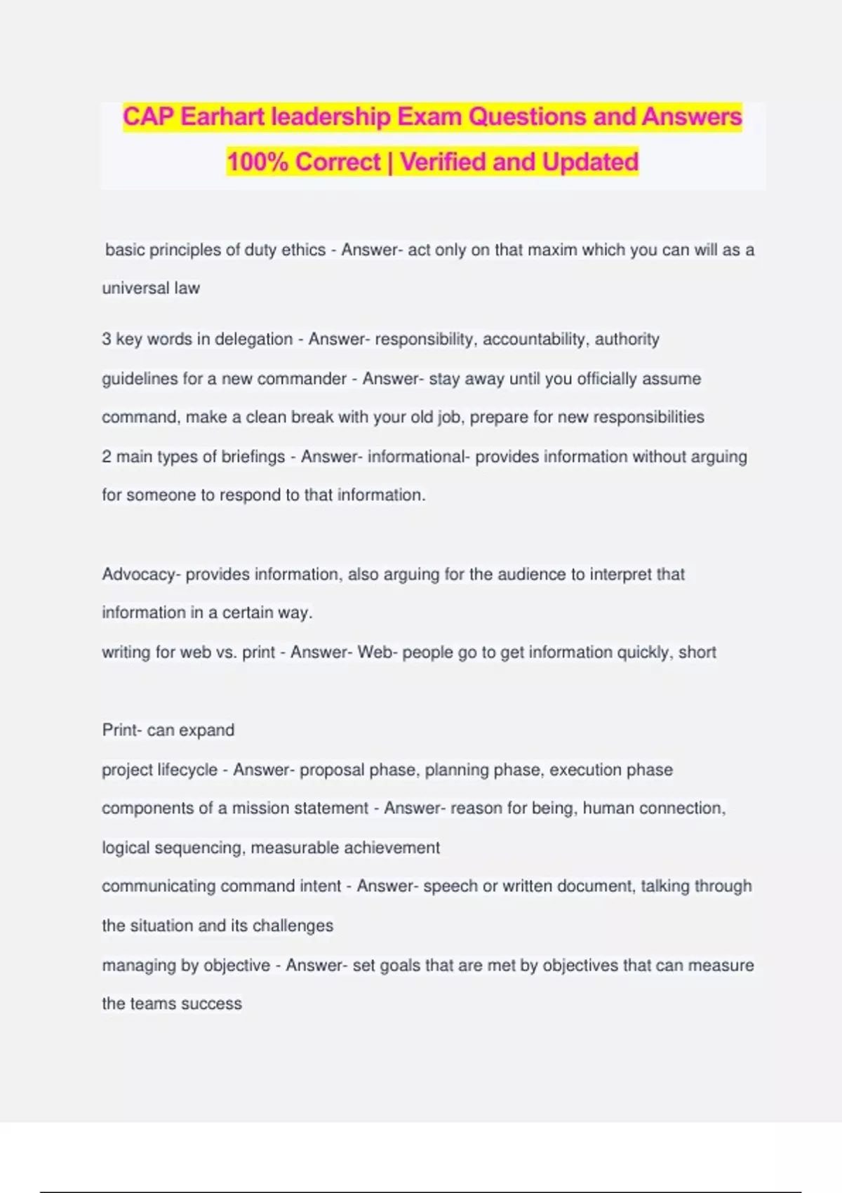 CAP Earhart leadership Exam Questions and Answers 100% Correct | Verified and Updated basic principles of duty ethics - Answer- act only on that maxim which you can will as a universal law 3 key words in delegation - Answer- responsibility, accountability, authority guidelines for a new commander - Answer- stay away until you officially assume command, make a clean break with your old job, prepare for new responsibilities 2 main types of briefings - Answer- informational- provides information without arguing for someone to respond to that information. Advocacy- provides information, also arguing for the audience to interpret that information in a certain way. writing for web vs. print - Answer- Web- people go to get information quickly, short Print- can expand project lifecycle - Answer- proposal phase, planning phase, execution phase components of a mission statement - Answer- reason for being, human connection, logical sequencing, measurable achievement communicating command intent - Answer- speech or written document, talking through the situation and its challenges managing by objective - Answer- set goals that are met by objectives that can measure the teams success performance appraisal - Answer- process of measuring how well an individual has fulfilled assigned duties and responsibilities war officers are managers - Answer- responsible for a program, activity, or administrative task that helps the organization effective delegation - Answer- the team: creativity, accomplishes more, makes better decisions 4 hazards of hiring a new person - Answer- halo effect, attraction bias, impressive references, nepotism developing a mission statement - Answer- involve the troops, consider stakeholder's perspectives, questions management - Answer- the practice of setting and achie