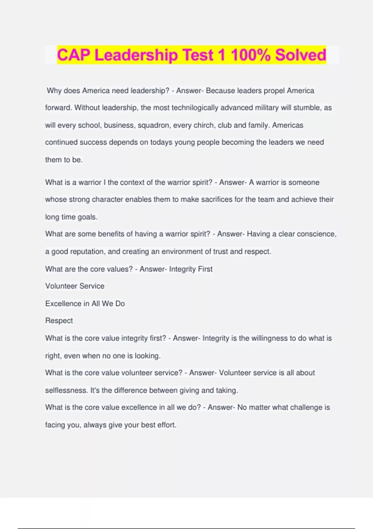 CAP Leadership Test 1 100% Solved Why does America need leadership? - Answer- Because leaders propel America forward. Without leadership, the most technilogically advanced military will stumble, as will every school, business, squadron, every chirch, club and family. Americas continued success depends on todays young people becoming the leaders we need them to be. What is a warrior I the context of the warrior spirit? - Answer- A warrior is someone whose strong character enables them to make sacrifices for the team and achieve their long time goals. What are some benefits of having a warrior spirit? - Answer- Having a clear conscience, a good reputation, and creating an environment of trust and respect. What are the core values? - Answer- Integrity First Volunteer Service Excellence in All We Do Respect What is the core value integrity first? - Answer- Integrity is the willingness to do what is right, even when no one is looking. What is the core value volunteer service? - Answer- Volunteer service is all about selflessness. It's the difference between giving and taking. What is the core value excellence in all we do? - Answer- No matter what challenge is facing you, always give your best effort. What is the core value respect - Answer- Someone who is respectful treats others as they would like to be treated. What is self-awareness? - Answer- The ability to monitor and judge your own actions? What is self-discipline? - Answer- The ability to detect your thoughts, emotions and actions toward a meaningful purpose. What is attitude? - Answer- The state of mind that lies behind your every action. What is an oath? - Answer- A solemn promis