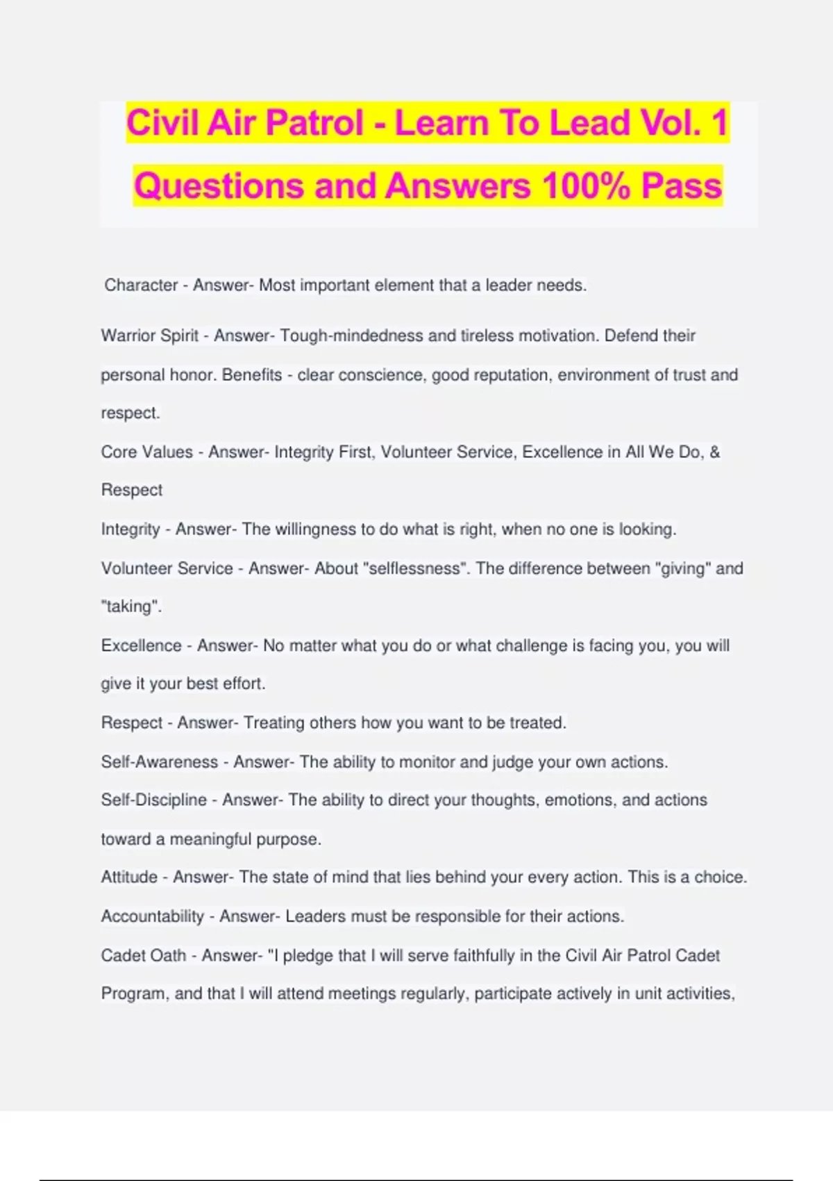 Civil Air Patrol - Learn To Lead Vol. 1 Questions and Answers 100% Pass Character - Answer- Most important element that a leader needs. Warrior Spirit - Answer- Tough-mindedness and tireless motivation. Defend their personal honor. Benefits - clear conscience, good reputation, environment of trust and respect. Core Values - Answer- Integrity First, Volunteer Service, Excellence in All We Do, & Respect Integrity - Answer- The willingness to do what is right, when no one is looking. Volunteer Service - Answer- About "selflessness". The difference between "giving" and "taking". Excellence - Answer- No matter what you do or what challenge is facing you, you will give it your best effort. Respect - Answer- Treating others how you want to be treated. Self-Awareness - Answer- The ability to monitor and judge your own actions. Self-Discipline - Answer- The ability to direct your thoughts, emotions, and actions toward a meaningful purpose. Attitude - Answer- The state of mind that lies behind your every action. This is a choice. Accountability - Answer- Leaders must be responsible for their actions. Cadet Oath - Answer- "I pledge that I will serve faithfully in the Civil Air Patrol Cadet Program, and that I will attend meetings regularly, participate actively in unit activities, obey my officers, wear my uniform properly, and advance my education and training rapidly to prepare myself to be of service to my community, state, and nation." Customs and Courtesies. - Answer- Rooted in basic politeness and respect. Helps strengthen self-discipline and maintain a positive attitude. Salute - Answer- Always outdoors. Never in formation. Includes military officers, cadet officers, and senior members. Position of Honor - Answer- Highest on right, lowest on left