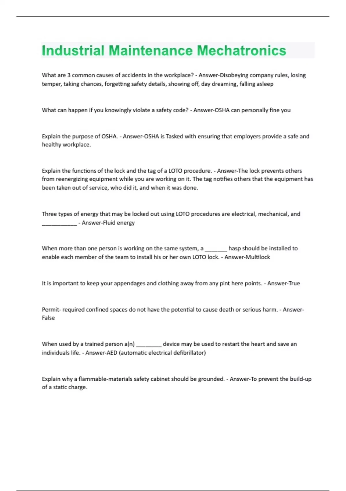 What are 3 common causes of accidents in the workplace? - Answer-Disobeying company rules, losing temper, taking chances, forgetting safety details, showing off, day dreaming, falling asleep What can happen if you knowingly violate a safety code? - Answer-OSHA can personally fine you Explain the purpose of OSHA. - Answer-OSHA is Tasked with ensuring that employers provide a safe and healthy workplace. Explain the functions of the lock and the tag of a LOTO procedure. - Answer-The lock prevents others from reenergizing equipment while you are working on it. The tag notifies others that the equipment has been taken out of service, who did it, and when it was done. Three types of energy that may be locked out using LOTO procedures are electrical, mechanical, and ___________ - Answer-Fluid energy When more than one person is working on the same system, a _______ hasp should be installed to enable each member of the team to install his or her own LOTO lock. - Answer-Multilock It is important to keep your appendages and clothing away from any pint here points. - Answer-True Permit- required confined spaces do not have the potential to cause death or serious harm. - AnswerFalse When used by a trained person a(n) ________ device may be used to restart the heart and save an individuals life. - Answer-AED (automatic electrical defibrillator) Explain why a flammable-materials safety cabinet should be grounded. - Answer-To prevent the build-up of a static charge.What branch of OSHA conducts research and experimental programs to develop criteria for safety and health standards? - Answer-NIOSH (national institute for occupational safety Which of the following must be provided by chemical manufacturers, distributors, and importers to anyone who will work with these potentially dangerous materials? - Answer-SDS (safety data sheets) A LOTO procedo should be performed to lock Out energy when working on which of the following systems? - Answer-Electrical, mechanical, and fluid energy systems What rating must a fire extinguisher have to be used for a fire involving live electrical equipment? - Answer-Class C A root cause analysis will ultimately cost more money than reactive maintenance. - AnswerThe two primary methods of proactive maintenance are preventive maintenance and _____________ maintenance. - AnswerWhat is an example of predictive maintenance? - AnswerWhat is a torque wrench and when should you use it? - AnswerWhat are two common misuses of pliers? - AnswerSince they are heavy and sturdy, it is acceptable to use lineman's pliers as a hammer? - Answer-False List the appropriate PPE you need when using a circular saw. - AnswerWhat measuring tool is best for objects larger than 6' that requisa moderate amount of accuracy? - AnswerWhich of the following is designed to remove items such as gears and bearings without damaging machinery? - AnswerThe _____ of a screw thread is the distance from one point on a thread to the corresponding point on the next thread. - AnswerExplain the difference between UNC and UNF threads? - AnswerIdentify the following types of nuts. - AnswerA(n) _______ pin is larger in diameter than the home in which it is installed and compresses to for the smaller size of the hole. - AnswerThe slot where a key fits on a shaft is called _________ - AnswerWhich of the following has a head at one end and external threads at the other to accept a nut? - AnswerA _______ nut has deformed threads or a nylon insert to produce interference during tightening. - AnswerThe slot where a key fits on the hun of a mating part is called the ________. - AnswerWhat is the difference between a clearance fit and and interferente for? - AnswerIt is important to find and correct the _______ of a problem, or the failure will only continue to happen. - AnswerCommunicating with the machine operator can provide valuable information to use towards solving a problem. - AnswerList the four major categories the causes of vibration are broken into and explain what they are. - AnswerIf you needed to make a measurement to 1/10,000 of an inch, would you use a digital caliper or a micrometer? - AnswerA steel Bench rule is used when extreme accuracy is necessary. - AnswerA(n) _____ is used to determine the tensión of a belt. - AnswerA digital vernier micrometer is necessary when your required measurement accuracy is to within ____ of an inch. - AnswerWhich of the following can be performed with and accelerometer or mechanics stethoscope and then used to identify faults, aiding in the prediction and prevention of failures in rotating machinery? - AnswerHow is kinetic energy affected if velocity of an objects is doubled? - AnswerGive an example of an object that has potential energy. - AnswerIf a fastener has a torque limit of 30 ft Lbs, and you have a torque wrench calibrated in in-lbs, what is the conversion? - AnswerGive an example of each class of levers and explain their position of the fulcrum, input force, and load. - AnswerIf a 175 Lb load is lifted on a fixed pulley, it is necessary to apply a force of _________ lb. - AnswerWhich object is storing gravitational potential energy? - Answer