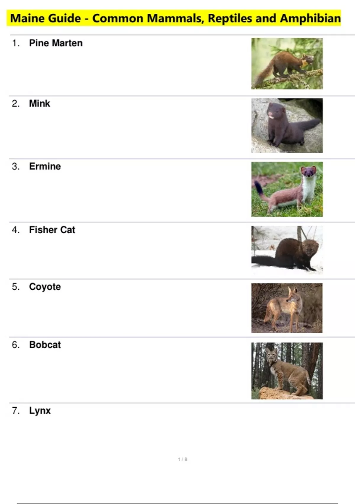 Maine Guide - Common Mammals, Reptiles and Amphibian with pictures