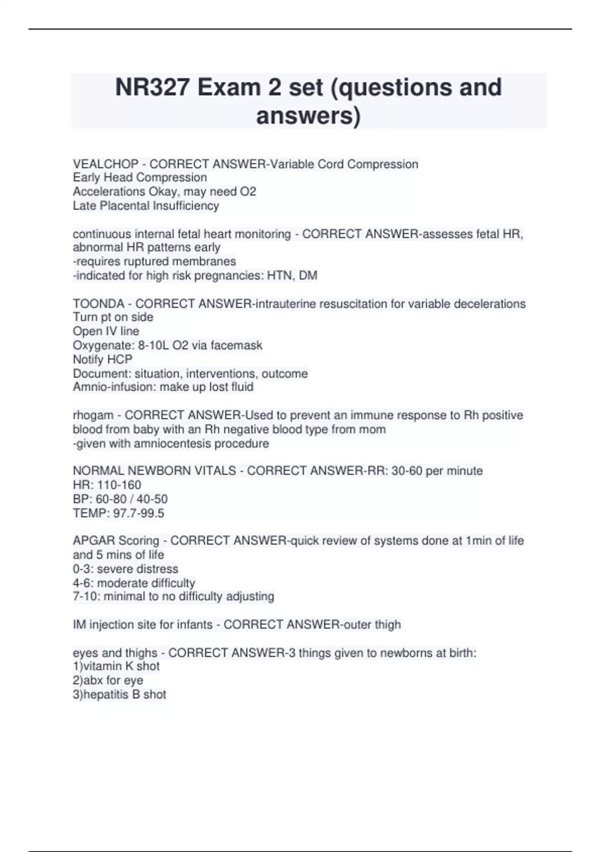 NR327 Exam 2 set (questions and answers) VEALCHOP - CORRECT ANSWER-Variable Cord Compression Early Head Compression Accelerations Okay, may need O2 Late Placental Insufficiency continuous internal fetal heart monitoring - CORRECT ANSWER-assesses fetal HR, abnormal HR patterns early -requires ruptured membranes -indicated for high risk pregnancies: HTN, DM TOONDA - CORRECT ANSWER-intrauterine resuscitation for variable decelerations Turn pt on side Open IV line Oxygenate: 8-10L O2 via facemask Notify HCP Document: situation, interventions, outcome Amnio-infusion: make up lost fluid rhogam - CORRECT ANSWER-Used to prevent an immune response to Rh positive blood from baby with an Rh negative blood type from mom -given with amniocentesis procedure NORMAL NEWBORN VITALS - CORRECT ANSWER-RR: 30-60 per minute HR: 110-160 BP: 60-80 / 40-50 TEMP: 97.7-99.5 APGAR Scoring - CORRECT ANSWER-quick review of systems done at 1min of life and 5 mins of life 0-3: severe distress 4-6: moderate difficulty 7-10: minimal to no difficulty adjusting IM injection site for infants - CORRECT ANSWER-outer thigh eyes and thighs - CORRECT ANSWER-3 things given to newborns at birth: 1)vitamin K shot 2)abx for eye 3)hepatitis B sho
