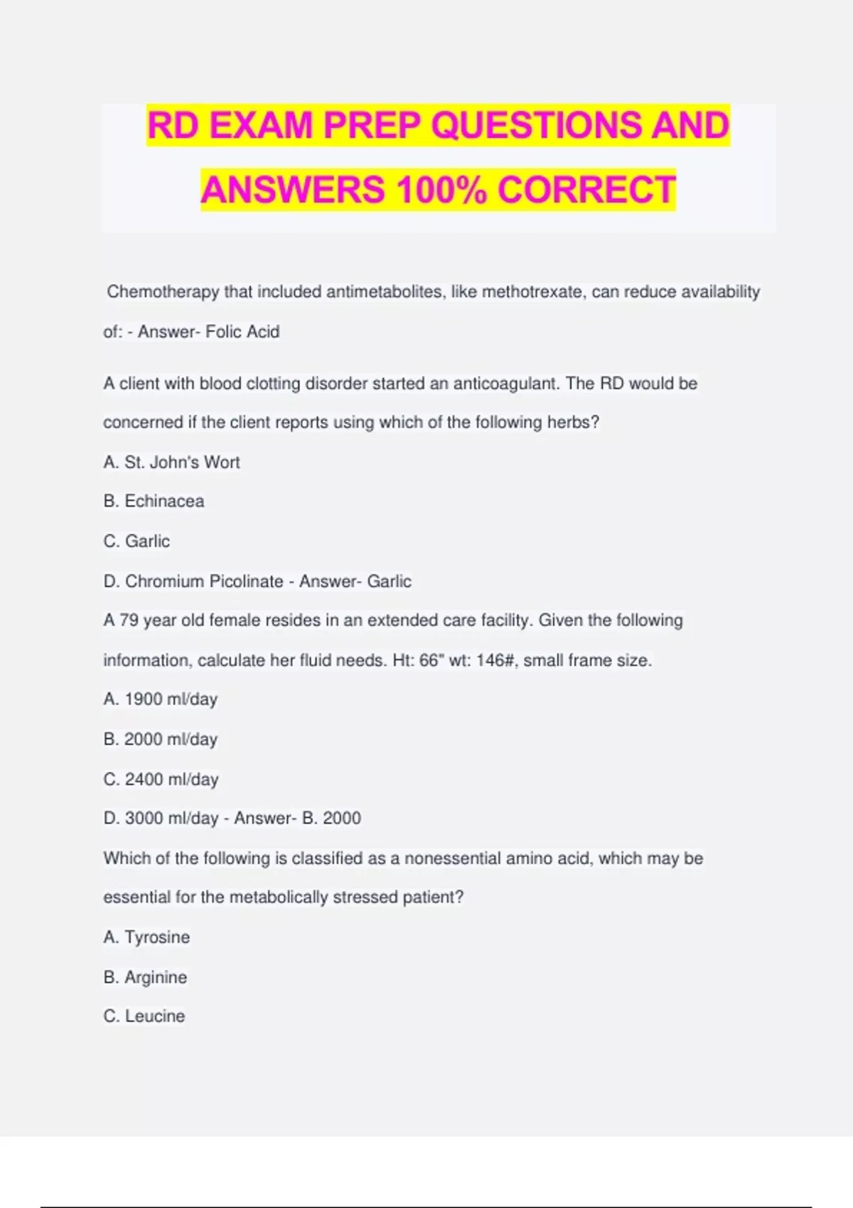 RD EXAM PREP QUESTIONS AND ANSWERS 100% CORRECT Chemotherapy that included antimetabolites, like methotrexate, can reduce availability of: - Answer- Folic Acid A client with blood clotting disorder started an anticoagulant. The RD would be concerned if the client reports using which of the following herbs? A. St. John's Wort B. Echinacea C. Garlic D. Chromium Picolinate - Answer- Garlic A 79 year old female resides in an extended care facility. Given the following information, calculate her fluid needs. Ht: 66" wt: 146#, small frame size. A. 1900 ml/day B. 2000 ml/day C. 2400 ml/day D. 3000 ml/day - Answer- B. 2000 Which of the following is classified as a nonessential amino acid, which may be essential for the metabolically stressed patient? A. Tyrosine B. Arginine C. Leucine D. Lysine - Answer- B.Arginine (only nonessential A.A. are Tyrosine and arginine) A severely malnourished patient receives TPN at a rate of 125 cc/hr. What could result? A. Hyperphosphatemia B. Hypermagnesemia C. Hypophosphatemia D. Hyponatremia - Answer- C. Hypophosphatemia The management of a burn pt includes the following nonprotein kilocalorie: nitrogen ratio. A. 300:1 B. 250:1 C. 200:1 D. 150:1 - Answer- D. A patient has been admitted to the hospital following a CVA, and the RD is informed that a swallowing evaluation indicates that the patient has dysphagia. The RD's first step should be: A. interview the patient's family to find out if there were any swallowing difficulties or eating problems prior to admission B. recommend a level 1 Pureed Dysphagia diet to be advanced as tolerated C. review the results and recommendations of the swallowing evaluation to determine the degree of dysphagia present D. inform the food service staff that the patient will need thickened liquids - Answer- C. review the results and recommendations of the swallowing evaluation to determine the degree of dysphagia present A patient has been on an enteral feeding for 5 days without complications, and then develops diarrhea. What would be the most likely cause? A. concentration of the tube feeding B. rate of the tube feeding C. amount of free water flush D. new medication - Answer- D. Metabolic alterations of Systemic Inflammatory Response Syndrome (SIRS) or sepsis include all of the following except: A. hypermetabolism B. hypoglycemia C. accelerated lipolysis D. protein catabolism - Answer- B. hypoglycemia A nutrition care plan recommendation of 30-35 kcal/kg and 1.0-1.2 g protein/kg per day would be appropriate for which type of liver disease? A. hepatitis B. fatty liver C. encephalopathy D. liver failure - Answer- A. hepatitis A patient is admitted to the ICU with: cachexia, ascites, nausea, vomiting, normal mental status, serum albumin of 2.5 g/dl, and elevated liver function tests. The MNT recommendations would include: A. high protein, low kcal, 4 gram Na B. fluid restriction, 2 gram Na, moderate protein C. fluid restriction, low protein, 2 gram Na D. high protein, high sodium, push fluids - Answer- B. fluid restriction, 2 gram Na, moderate protein A patient with Type I diabetes presents to the ER with dehydration and Kussmaul respirations. Urinalysis reveals ketonuria, lab