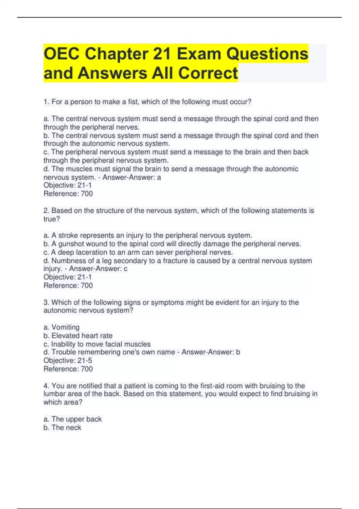 OEC Chapter 21 Exam Questions and Answers All Correct 1. For a person to make a fist, which of the following must occur? a. The central nervous system must send a message through the spinal cord and then through the peripheral nerves. b. The central nervous system must send a message through the spinal cord and then through the autonomic nervous system. c. The peripheral nervous system must send a message to the brain and then back through the peripheral nervous system. d. The muscles must signal the brain to send a message through the autonomic nervous system. - Answer-Answer: a Objective: 21-1 Reference: 700 2. Based on the structure of the nervous system, which of the following statements is true? a. A stroke represents an injury to the peripheral nervous system. b. A gunshot wound to the spinal cord will directly damage the peripheral nerves. c. A deep laceration to an arm can sever peripheral nerves. d. Numbness of a leg secondary to a fracture is caused by a central nervous system injury. - Answer-Answer: c Objective: 21-1 Reference: 700 3. Which of the following signs or symptoms might be evident for an injury to the autonomic nervous system? a. Vomiting b. Elevated heart rate c. Inability to move facial muscles d. Trouble remembering one's own name - Answer-Answer: b Objective: 21-5 Reference: 700 4. You are notified that a patient is coming to the first-aid room with bruising to the lumbar area of the back. Based on this statement, you would expect to find bruising in which area? a. The upper back b. The neck c. The lower back d. The buttocks - Answer-Answer: c Objective: 21-3 Reference: 711 5. You respond to an accident at which a male patient is complaining of severe back pain. He informs you that his back pain is coming from a recent fracture of his coccyx. Based on this information, what area of the back would the pain be emanating from? a. The neck b. The upper back c. The tailbone d. The lower back - Answer-Answer: c Objective: 21-3 Reference: 711 6. A patient involved in a motor-vehicle collision has suffered the separation of a rib from a spinal vertebra. Based on the anatomy of the spine, where has this injury occurred? a. The lumbar spine b. The cervical spine c. The middle spine d. The thoracic spine - Answer-Answer: d Objective: 21-3 Reference: 712 7. Based on the anatomy of the spine, which one of the following injuries is possible? a. A fracture of the ninth cervical vertebra b. A dislocation of lumbar vertebra 7 c. A disk injury between thoracic vertebrae 11 and 12 d. A compression fracture of lumbar vertebra 12 - Answer-Answer: c Objective: 21-5 Reference: 699 8. A young intoxicated male patient cannot move his lower extremities after diving into the shallow end of a pool and hitting the bottom with his head. Which of the following mechanisms is most likely to be responsible for this injury? a. Compression b. Rotation c. Distraction d. Penetration - Answer-Answer: a Objective: 21-4 Reference: 702 9. A young female was involved in a motor-vehicle collision in which her car struck the rear end of another vehicle. As a result of the impact, her neck muscles were overstretched and torn. She is complaining of neck pain. Based on this mechanism, the most likely type of injury she has is: a. neural ischemia. b. whiplash. c. translational strain. d. a Jefferson fracture. - Answer-Answer: b Objective: 21-6 Reference: 711