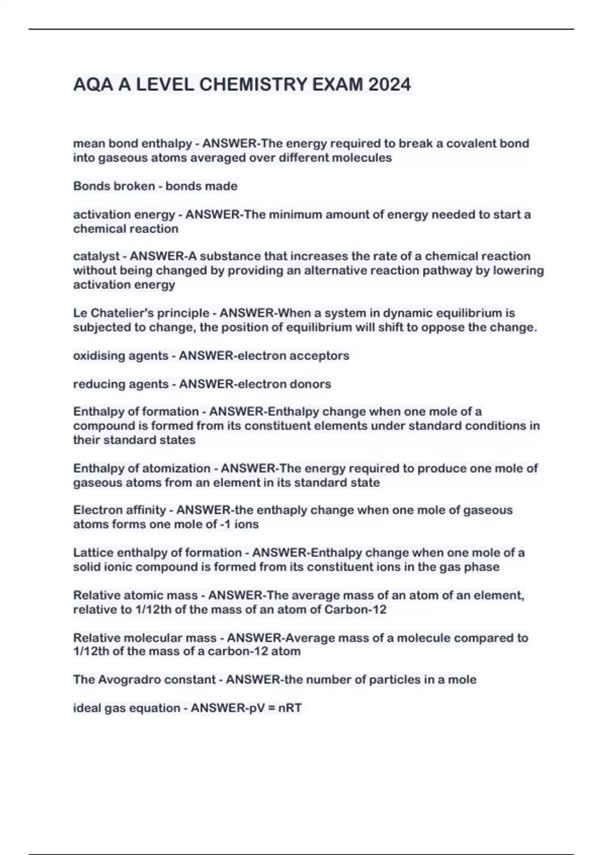 AQA A LEVEL CHEMISTRY EXAM 2024 mean bond enthalpy - ANSWER-The energy required to break a covalent bond into gaseous atoms averaged over different molecules Bonds broken - bonds made activation energy - ANSWER-The minimum amount of energy needed to start a chemical reaction catalyst - ANSWER-A substance that increases the rate of a chemical reaction without being changed by providing an alternative reaction pathway by lowering activation energy Le Chatelier's principle - ANSWER-When a system in dynamic equilibrium is subjected to change, the position of equilibrium will shift to oppose the change. oxidising agents - ANSWER-electron acceptors reducing agents - ANSWER-electron donors Enthalpy of formation - ANSWER-Enthalpy change when one mole of a compound is formed from its constituent elements under standard conditions in their standard states Enthalpy of atomization - ANSWER-The energy required to produce one mole of gaseous atoms from an element in its standard state Electron affinity - ANSWER-the enthaply change when one mole of gaseous atoms forms one mole of -1 ions Lattice enthalpy of formation - ANSWER-Enthalpy change when one mole of a solid ionic compound is formed from its constituent ions in the gas phase Relative atomic mass - ANSWER-The average mass of an atom of an element, relative to 1/12th of the mass of an atom of Carbon-12 Relative molecular mass - ANSWER-Average mass of a molecule compared to 1/12th of the mass of a carbon-12 atom