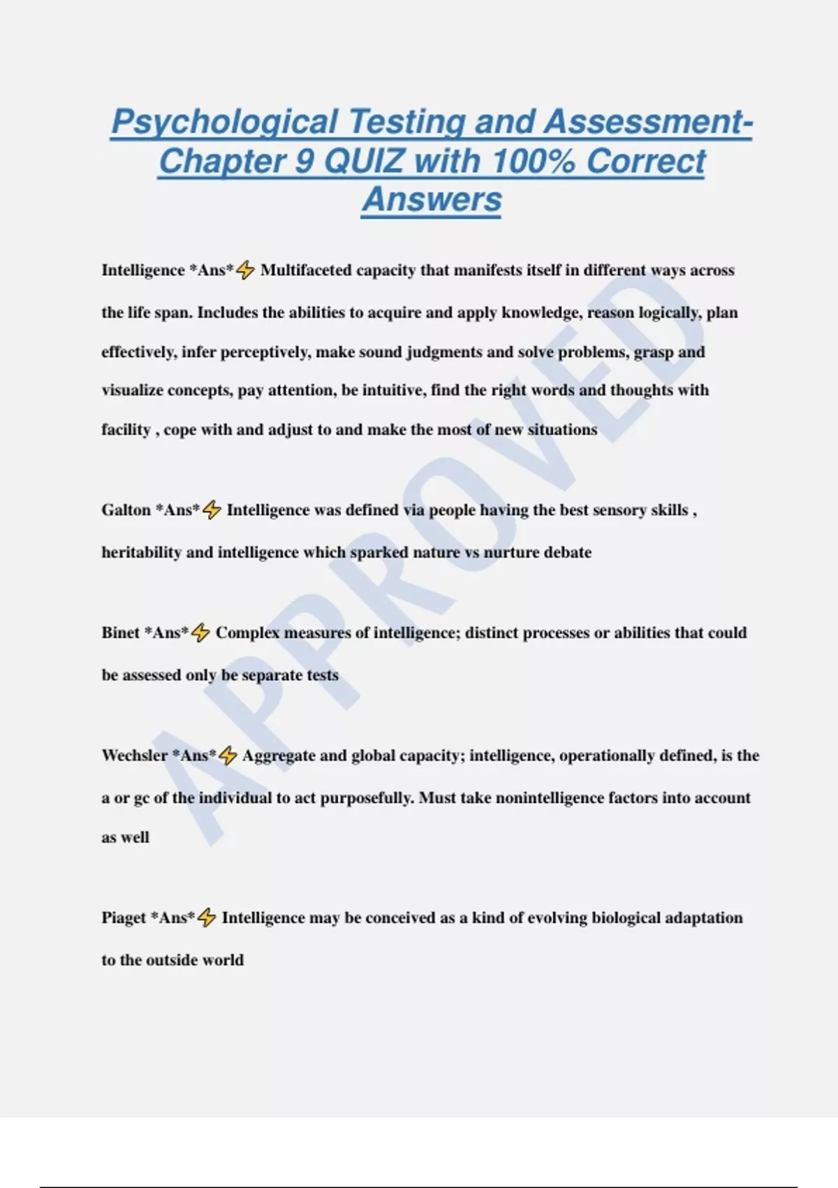 Psychological Testing and AssessmentChapter 9 QUIZ with 100% Correct Answers Intelligence *Ans* Multifaceted capacity that manifests itself in different ways across the life span. Includes the abilities to acquire and apply knowledge, reason logically, plan effectively, infer perceptively, make sound judgments and solve problems, grasp and visualize concepts, pay attention, be intuitive, find the right words and thoughts with facility , cope with and adjust to and make the most of new situations Galton *Ans* Intelligence was defined via people having the best sensory skills , heritability and intelligence which sparked nature vs nurture debate Binet *Ans* Complex measures of intelligence; distinct processes or abilities that could be assessed only be separate tests Wechsler *Ans* Aggregate and global capacity; intelligence, operationally defined, is the a or gc of the individual to act purposefully. Must take nonintelligence factors into account as well Piaget *Ans* Intelligence may be conceived as a kind of evolving biological adaptation to the outside world Interactionism *Ans* A complex concept in which heredity and environment are presumed to interact and influence the development of one's intelligence (Thurston's primary mental abilities- PMAs) factor analytic theories *Ans* 1. Focus on identifying the ability or groups of abilities deemed to constitute intelligence. Factor analysis *Ans* Group of statistical techniques designed to determine the existence of underlying relationships between sets of variables, including test scores Two factor theory of intelligence *Ans* Existence of a general intellectual ability factor (g) is partially tapped by all other mental abilities; remaining portions of variance being accounting for a test that is not general (s). Tests with high positive correlations with other intelligence tests were thought to be highly saturated with g while low tests were s like visual or motor) Group factors *Ans* Common factors to a group of activities but not to all Interpersonal/Intrapersonal intelligence *Ans
