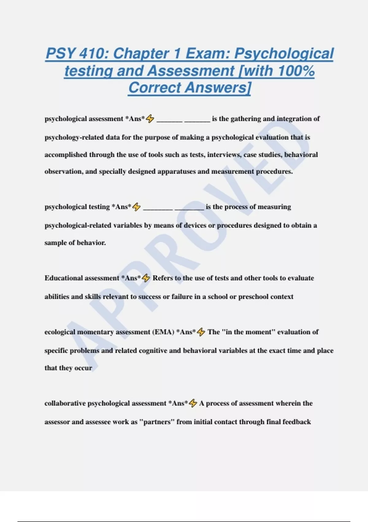 PSY 410: Chapter 1 Exam: Psychological testing and Assessment [with 100% Correct Answers] psychological assessment *Ans* _______ _______ is the gathering and integration of psychology-related data for the purpose of making a psychological evaluation that is accomplished through the use of tools such as tests, interviews, case studies, behavioral observation, and specially designed apparatuses and measurement procedures. psychological testing *Ans* ________ ________ is the process of measuring psychological-related variables by means of devices or procedures designed to obtain a sample of behavior. Educational assessment *Ans* Refers to the use of tests and other tools to evaluate abilities and skills relevant to success or failure in a school or preschool context ecological momentary assessment (EMA) *Ans* The "in the moment" evaluation of specific problems and related cognitive and behavioral variables at the exact time and place that they occur collaborative psychological assessment *Ans* A process of assessment wherein the assessor and assessee work as "partners" from initial contact through final feedback therapeutic psychological assessment *Ans* A collaborative approach wherein discovery of therapeutic insights about oneself are encouraged and actively promoted by the assessor throughout the assessment process dynamic assessment *Ans* An interactive approach to psychological assessment that usually follows a model of (1) evaluation, (2) intervention of some sort, and (3) evaluation Scoring *Ans* The process of assigning evaluative codes or statements to performance on tests, tasks, interviews, or other behavior samples cut score *Ans* a reference point (usually numerical) derived as a result of judgment and used to divide a set of data into two or more classifications, with some action to be taken or some inference to be made on the basis of these classifications psychometric soundness *Ans* The technical quality of a test or other tool of assessment psychometrics *Ans* The science of psychological measurement (synonymous with the antiquated term psychometry) psychometrist *Ans* A professional in testing and assessment who typically holds a master's degree in psychology or education and is qualified to administer specific tests; contrast with psychometrician Motivational interviewing *Ans*
