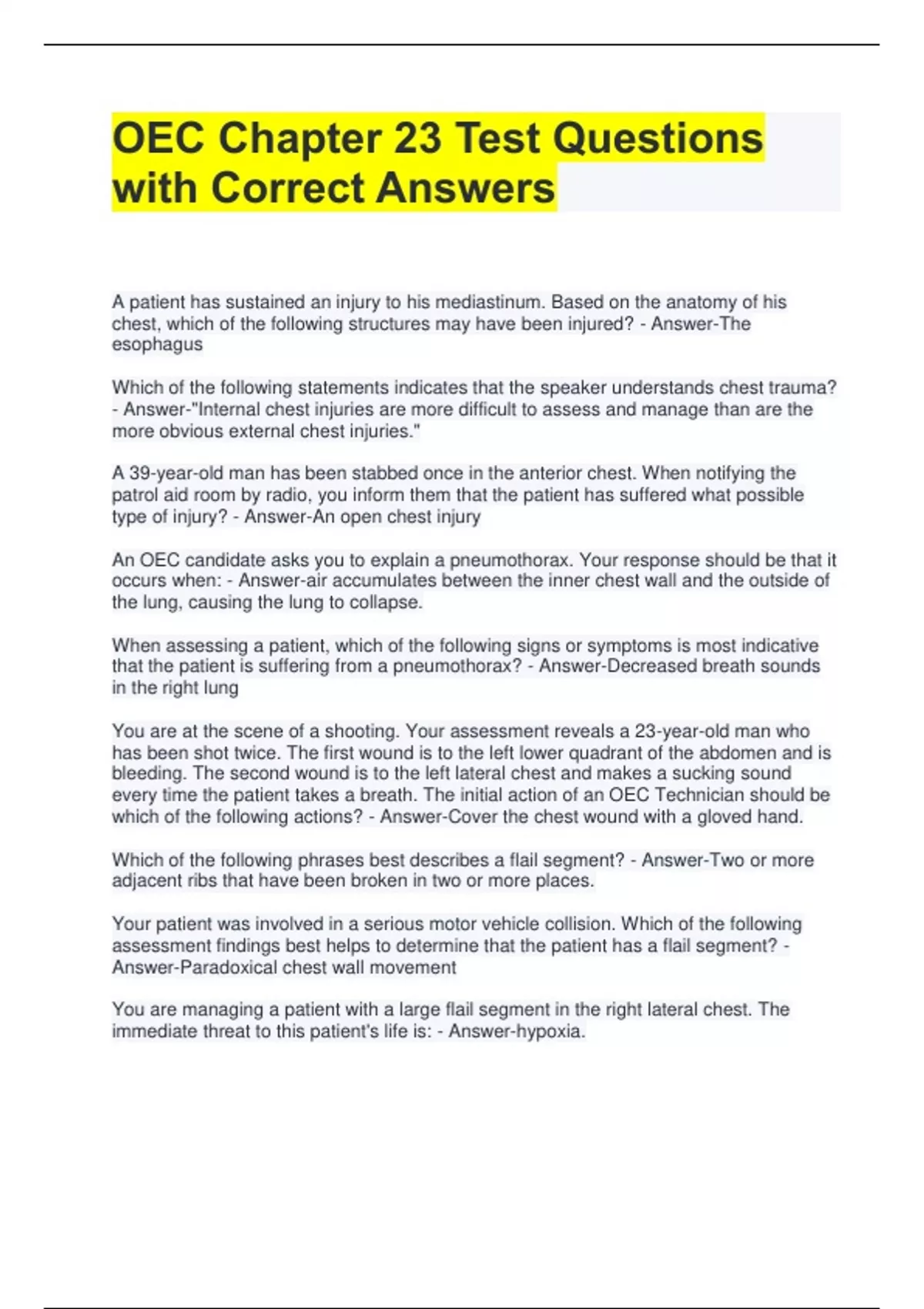 OEC Chapter 23 Test Questions with Correct Answers A patient has sustained an injury to his mediastinum. Based on the anatomy of his chest, which of the following structures may have been injured? - Answer-The esophagus Which of the following statements indicates that the speaker understands chest trauma? - Answer-"Internal chest injuries are more difficult to assess and manage than are the more obvious external chest injuries." A 39-year-old man has been stabbed once in the anterior chest. When notifying the patrol aid room by radio, you inform them that the patient has suffered what possible type of injury? - Answer-An open chest injury An OEC candidate asks you to explain a pneumothorax. Your response should be that it occurs when: - Answer-air accumulates between the inner chest wall and the outside of the lung, causing the lung to collapse. When assessing a patient, which of the following signs or symptoms is most indicative that the patient is suffering from a pneumothorax? - Answer-Decreased breath sounds in the right lung You are at the scene of a shooting. Your assessment reveals a 23-year-old man who has been shot twice. The first wound is to the left lower quadrant of the abdomen and is bleeding. The second wound is to the left lateral chest and makes a sucking sound every time the patient takes a breath. The initial action of an OEC Technician should be which of the following actions? - Answer-Cover the chest wound with a gloved hand. Which of the following phrases best describes a flail segment? - Answer-Two or more adjacent ribs that have been broken in two or more places. Your patient was involved in a serious motor vehicle collision. Which of the following assessment findings best helps to determine that the patient has a flail segment? - Answer-Paradoxical chest wall movement You are managing a patient with a large flail segment in the right lateral chest. The immediate threat to this patient's life is: - Answer-hypoxia.