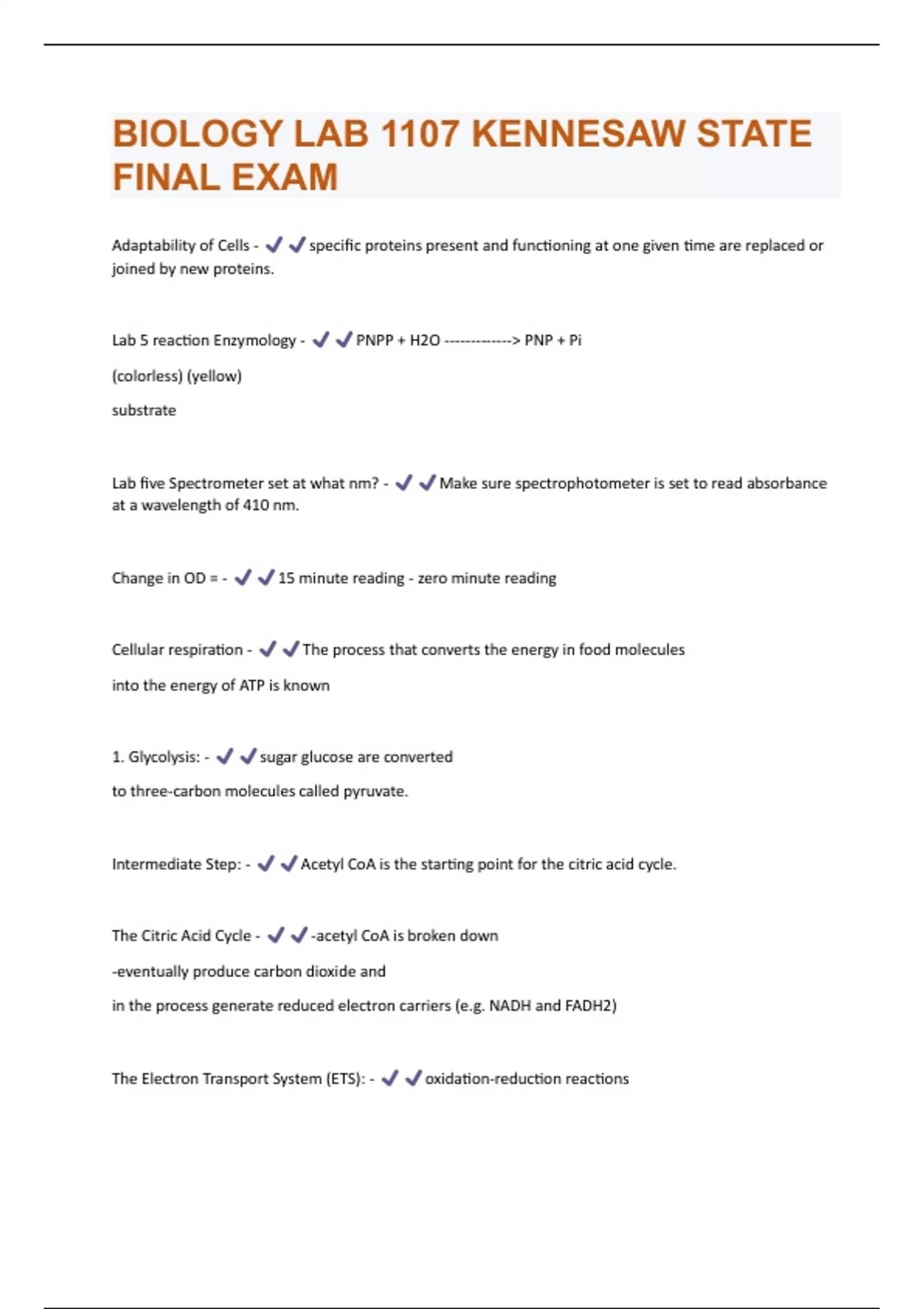 Adaptability of Cells - specific proteins present and functioning at one given time are replaced or joined by new proteins. Lab 5 reaction Enzymology - PNPP + H2O -------------> PNP + Pi (colorless) (yellow) substrate Lab five Spectrometer set at what nm? - Make sure spectrophotometer is set to read absorbance at a wavelength of 410 nm. Change in OD = - 15 minute reading - zero minute reading Cellular respiration - The process that converts the energy in food molecules into the energy of ATP is known 1. Glycolysis: - sugar glucose are converted to three-carbon molecules called pyruvate. Intermediate Step: - Acetyl CoA is the starting point for the citric acid cycle. The Citric Acid Cycle - -acetyl CoA is broken down -eventually produce carbon dioxide and in the process generate reduced electron carriers (e.g. NADH and FADH2) The Electron Transport System (ETS): - oxidation-reduction reactionsWhere does the Citric Acid Cycle occur ? - The citric acid cycle occurs within mitochondria. Initial reaction catalyzed by succinate dehydrogenase - Succinate + FAD -----> fumarate + FADH2 Reaction 1: Lab 6 - Succinate + FAD ----------------------------> fumarate + FADH2 Reaction 2: Lab 6 - Rx. 2: FADH2 + DCIPox --------------------------> FAD + DCIPred (blue) (colorless) Prediction for Lab 6 cellular respiration: - If the citric acid cycle occurs within the mitochondria then the fraction with mitochondria will have the highest SA values. Calculation for Lab 6 cellular respiration OD: - OD at 15 minutes - OD at 0 minutes/ 15 minutes Calculate EU - Average OD/minute (from Step 3) x Total Dilution = micromoles catalyzed DCIP = ______ EU OD/micromoles DCIP (from Step 4) minute (from Step 2) SA in Enzyme Activity: - THE SA IS DEFINED AS THE NUMBER OF ENZYME UNITS (EU) PER MILLIGRAM OF TOTAL PROTEIN IN THE SAMPLE. mitosis - specifically refers to the partitioning of the chromosomes.Interphase G1 - the cell undergoes general growth Interphase S - the chromosomes are duplicated. Interphase G2 - the cell makes special structures