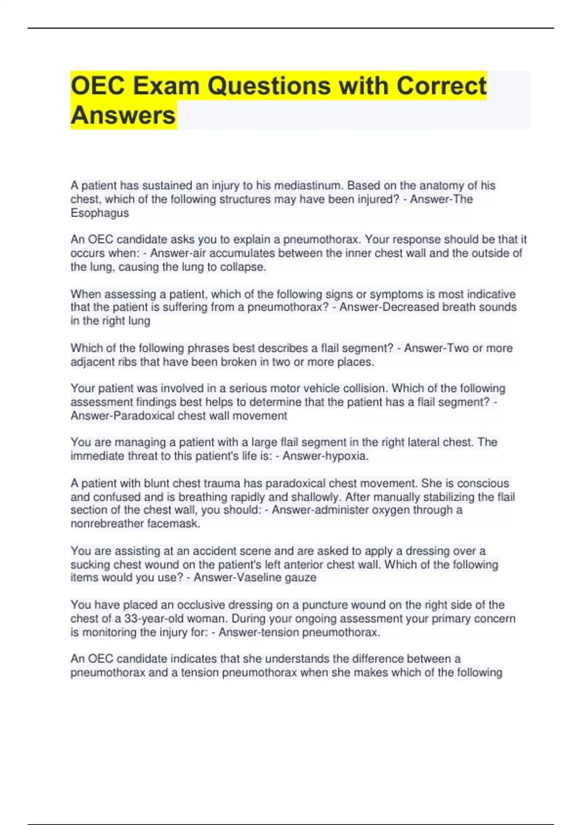 OEC Exam Questions with Correct Answers A patient has sustained an injury to his mediastinum. Based on the anatomy of his chest, which of the following structures may have been injured? - Answer-The Esophagus An OEC candidate asks you to explain a pneumothorax. Your response should be that it occurs when: - Answer-air accumulates between the inner chest wall and the outside of the lung, causing the lung to collapse. When assessing a patient, which of the following signs or symptoms is most indicative that the patient is suffering from a pneumothorax? - Answer-Decreased breath sounds in the right lung Which of the following phrases best describes a flail segment? - Answer-Two or more adjacent ribs that have been broken in two or more places. Your patient was involved in a serious motor vehicle collision. Which of the following assessment findings best helps to determine that the patient has a flail segment? - Answer-Paradoxical chest wall movement You are managing a patient with a large flail segment in the right lateral chest. The immediate threat to this patient's life is: - Answer-hypoxia. A patient with blunt chest trauma has paradoxical chest movement. She is conscious and confused and is breathing rapidly and shallowly. After manually stabilizing the flail section of the chest wall, you should: - Answer-administer oxygen through a nonrebreather facemask. You are assisting at an accident scene and are asked to apply a dressing over a sucking chest wound on the patient's left anterior chest wall. Which of the following items would you use? - Answer-Vaseline gauze You have placed an occlusive dressing on a puncture wound on the right side of the chest of a 33-year-old woman. During your ongoing assessment your primary concern is monitoring the injury for: - Answer-tension pneumothorax. An OEC candidate indicates that she understands the difference between a pneumothorax and a tension pneumothorax when she makes which of the following statements? - Answer-"A tension pneumothorax can cause cardiac output to decrease; a pneumothorax does not." You suspect that a trauma patient is suffering from a hemothorax to the left lung. Which of the following assessment findings would reinforce your suspicion? - AnswerRespiratory distress and the signs and symptoms of shock You are listening to two patrollers discuss the accident to which they just responded. Which of the following injuries would lead you to believe that one of the patients had suffered from traumatic asphyxia? - Answer-Bluish discoloration of the neck and face The thorax is enclosed by the: - Answer-ribs, sternum, thoracic spine, and diaphragm. The heart and lungs are located in the: - Answer-thoracic cavity. The diaphragm separates the: - Answer-thoracic cavity from the abdominal cavity. Your 35-year-old patient has received major chest trauma. He complains of shortness of breath and pain. Your assessment reveals distended neck veins and pulsus paradoxus. Based on these signs and symptoms, you believe the patient to be suffering from: - Answer-pericardial tamponade. The most serious chest injury resulting from rapid deceleration is - Answer-aortic rupture. Commotio cordis is sudden cardiac death resulting from - Answer-blunt trauma, usually in children younger than 16 years old. You are instructing a class in Outdoor Emergency Care when a student asks you to explain the L.A.P. method of examining the thorax. Your best reply to this question would be which of the following statements? - Answer-"The L.A.P. method directs you to look, auscultate, and palpate the chest." You are treating a 26-year-old man who fell about 20 feet while rock climbing. He is complaining of right sided chest discomfort and dyspnea. You note that his respiratory rate is 28 and shallow. Based on this assessment, the best emergency care would be: - Answer-performing a rapid body survey and assisting ventilations with BVM and highflow oxygen.