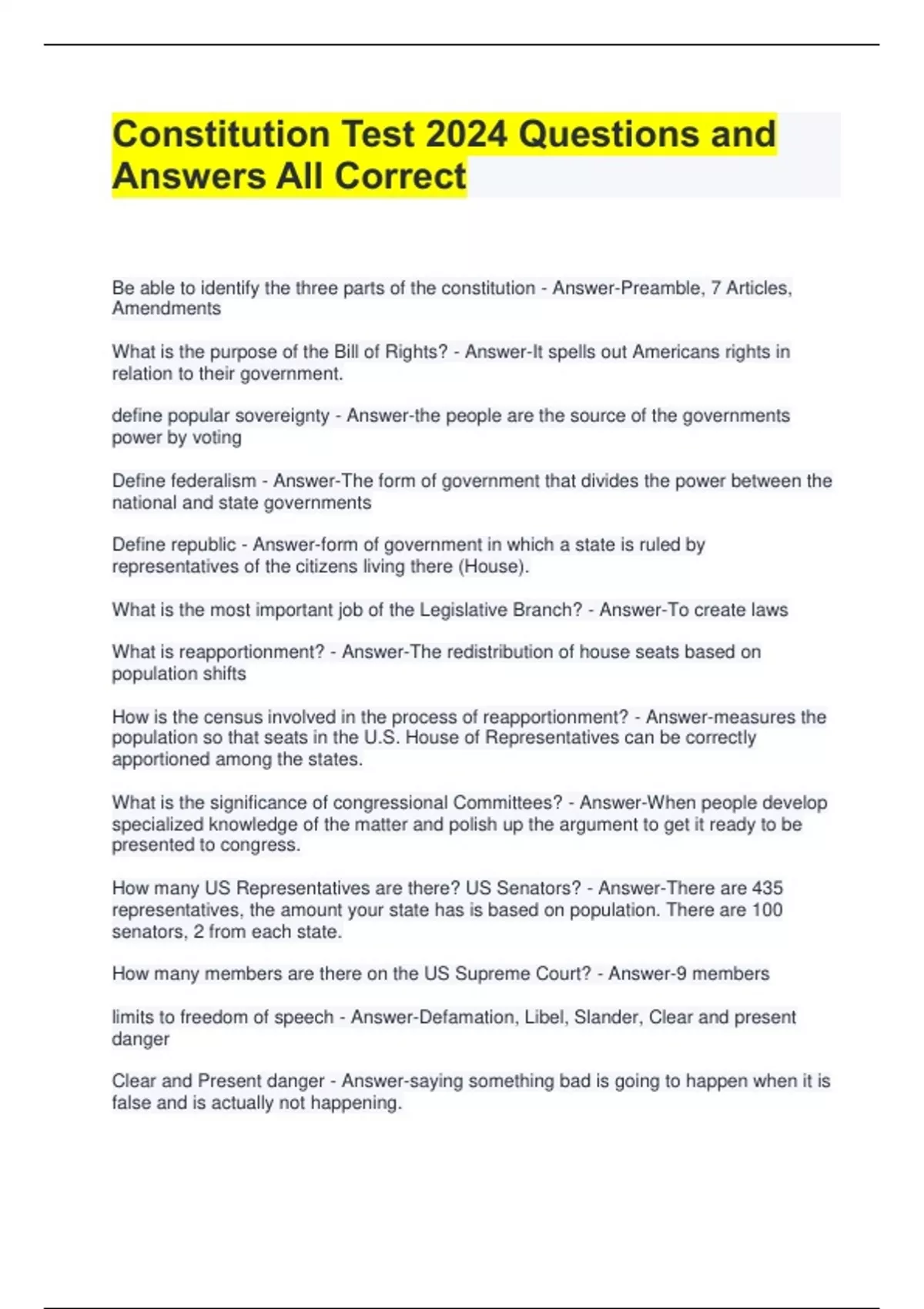 Constitution Test 2024 Questions and Answers All Correct Be able to identify the three parts of the constitution - Answer-Preamble, 7 Articles, Amendments What is the purpose of the Bill of Rights? - Answer-It spells out Americans rights in relation to their government. define popular sovereignty - Answer-the people are the source of the governments power by voting Define federalism - Answer-The form of government that divides the power between the national and state governments Define republic - Answer-form of government in which a state is ruled by representatives of the citizens living there (House). What is the most important job of the Legislative Branch? - Answer-To create laws What is reapportionment? - Answer-The redistribution of house seats based on population shifts How is the census involved in the process of reapportionment? - Answer-measures the population so that seats in the U.S. House of Representatives can be correctly apportioned among the states. What is the significance of congressional Committees? - Answer-When people develop specialized knowledge of the matter and polish up the argument to get it ready to be presented to congress. How many US Representatives are there? US Senators? - Answer-There are 435 representatives, the amount your state has is based on population. There are 100 senators, 2 from each state. How many members are there on the US Supreme Court? - Answer-9 members limits to freedom of speech - Answer-Defamation, Libel, Slander, Clear and present danger Clear and Present danger - Answer-saying something bad is going to happen when it is false and is actually not happening. Slander - Answer-making a false spoken statement that damages one's reputation Libel - Answer-A published false statement that damages one's reputation Defamation - Answer-The action of damaging the good reputation of someone What is the most important power granted to the U.S. Supreme Court? - Answer-The power to interpret the Constitution
