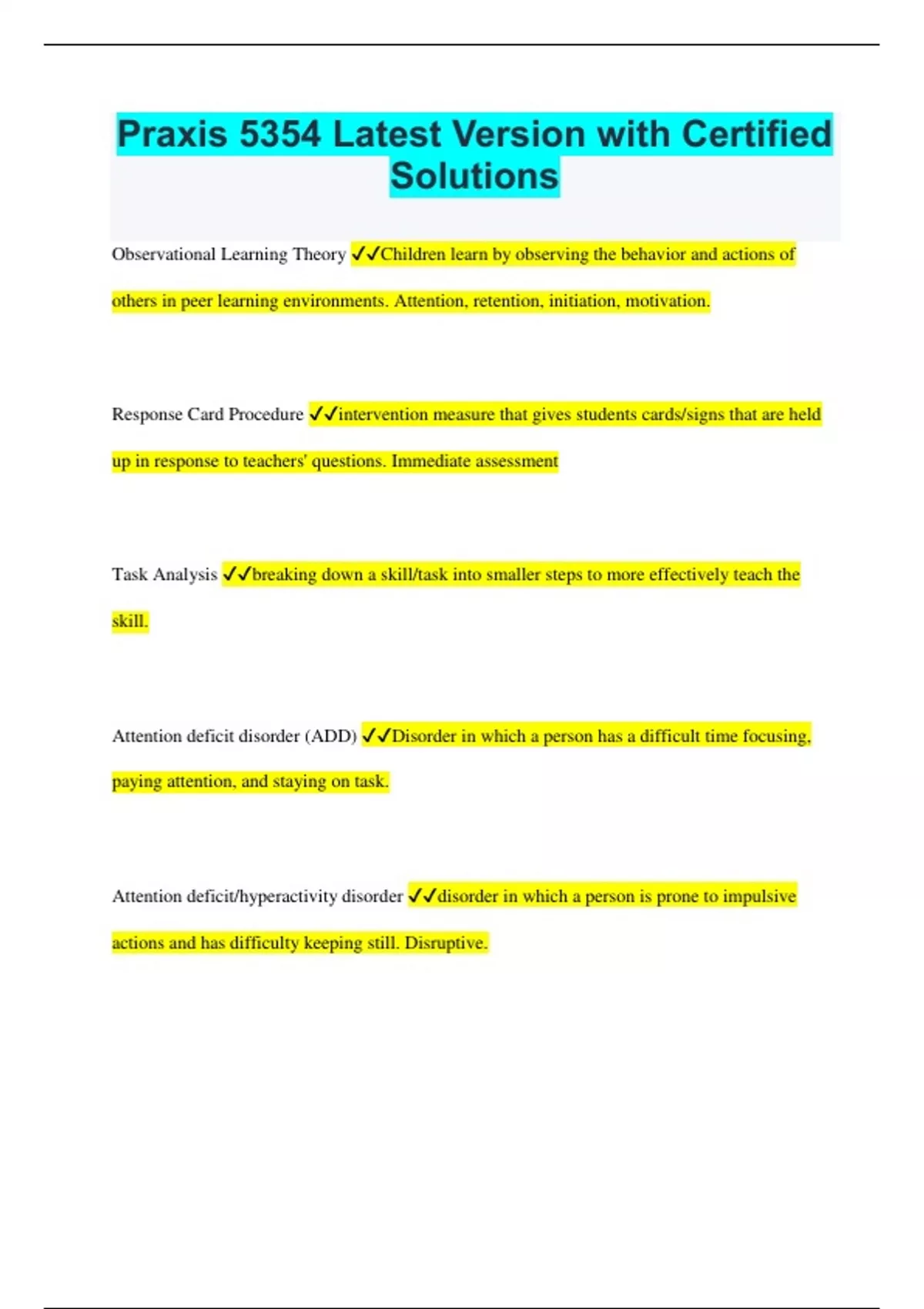 Praxis 5354 Latest Version with Certified Solutions Observational Learning Theory Children learn by observing the behavior and actions of others in peer learning environments. Attention, retention, initiation, motivation. Response Card Procedure intervention measure that gives students cards/signs that are held up in response to teachers' questions. Immediate assessment Task Analysis breaking down a skill/task into smaller steps to more effectively teach the skill. Attention deficit disorder (ADD) Disorder in which a person has a difficult time focusing, paying attention, and staying on task. Attention deficit/hyperactivity disorder disorder in which a person is prone to impulsive actions and has difficulty keeping still. Disruptive. Support Intensity Scales assessment that measures how much assistance a person with disabilities may need to function to their best. It measures over 57 life activities to determine the level of support a person may need later in life. INCLUDE strategy seven step process that focuses on accommodating students with special needs or Culturally Diverse backgrounds. Developmental Delay lack of or reduced progress in developing skills as expected for children of a certain age. "Impairment of general intellectual functioning" refers to condition in which people have an IQ (intellectual quotient) of less that 70 "substantial intellectual deficits" people with an IQ score in the 71-75 range. Recommend administering other measures/tests/evaluations Weschsler Intelligence Scale for Children-111 viewed as the universal standard intelligence test used most often by school psychologists and is used for children age 6 to 16 Minneapolis model three stage model that employs the term SNAP to refer to students that are in need of alternative programming or disability