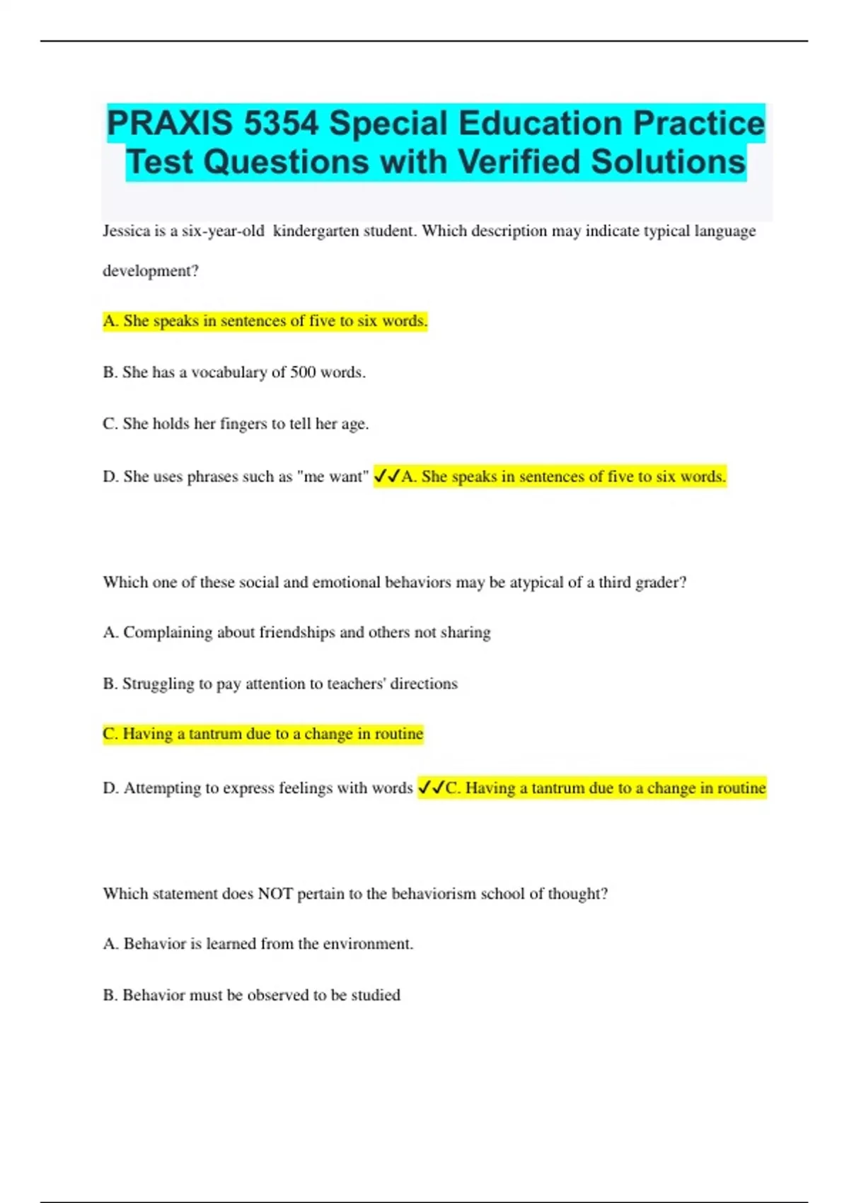 PRAXIS 5354 Special Education Practice Test Questions with Verified Solutions Jessica is a six-year-old kindergarten student. Which description may indicate typical language development? A. She speaks in sentences of five to six words. B. She has a vocabulary of 500 words. C. She holds her fingers to tell her age. D. She uses phrases such as "me want" A. She speaks in sentences of five to six words. Which one of these social and emotional behaviors may be atypical of a third grader? A. Complaining about friendships and others not sharing B. Struggling to pay attention to teachers' directions C. Having a tantrum due to a change in routine D. Attempting to express feelings with words C. Having a tantrum due to a change in routine Which statement does NOT pertain to the behaviorism school of thought? A. Behavior is learned from the environment. B. Behavior must be observed to be studied C. Behavior comes from a stimulus response. D. Behavior is learned differently in humans and animals D. Behavior is learned differently in humans and animals. Josh is a fourth-grade student with a specific learning disability in reading fluency. What would be the best strategy to motivate Josh to make improvements with his reading. A. Giving him extra practice for homework B. Letting him skip some of his reading homework C. Allowing him to pick what story he would like to read C. Allowing him to pick what story he would like to read According to the Individuals with Disabilities Education Act (IDEA), which conditions could fall under the umbrella term of specific learning disability? A. Speech or language impairment B. Auditory processing disorder C. Attention deficit disorder D. Bipolar disorder B. Auditory processing disorder Chris is a sixth grader who receives services as a student with autism spectrum disorder. Which would be the best response when he shows frustration in the classroom? A. Giving him a sensory break B. Talking to him in the hallway about what s bothering him C. Asking him to try a new activity A. Giving him a sensory break Which disorder is NOT listed under the Individuals with Disabilities Education Act (IDEA's) definition of the speech or language impairment category? A. Stuttering B. impaired articulation C. Voice Impairment D. Dysgraphia D. Dysgraphia Jessica is a fourteen-year old who currently receives services as a student with a traumatic brain injury. Which challenge will she most likely face across her life span? A. Loss of hearing B. Loss of memory C. Loss of sense of taste D. Loss of relationships B. Loss of memory A students with which disability would be the most likely to access independent living skills services throughout his or her lifetime? A. Down syndrome B. Attention deficit hyperactivity disorder (ADHD) C. Deafness D. Traumatic brain disorder A. Down syndrome Alex is a second-grade student whose first language is not English. In determining his eligibility for special education services, what must be considered? A. What his first language is B. where he was born C. Whether or not he is fluent in English D. What English language learner services he has previously received. D. What English language learner services he has previously received According to the National Center for Education Statistics, 25 percent of male students receive special education services. Which of the following does NOT explain why a higher percentage of male students receive services compared to female students?