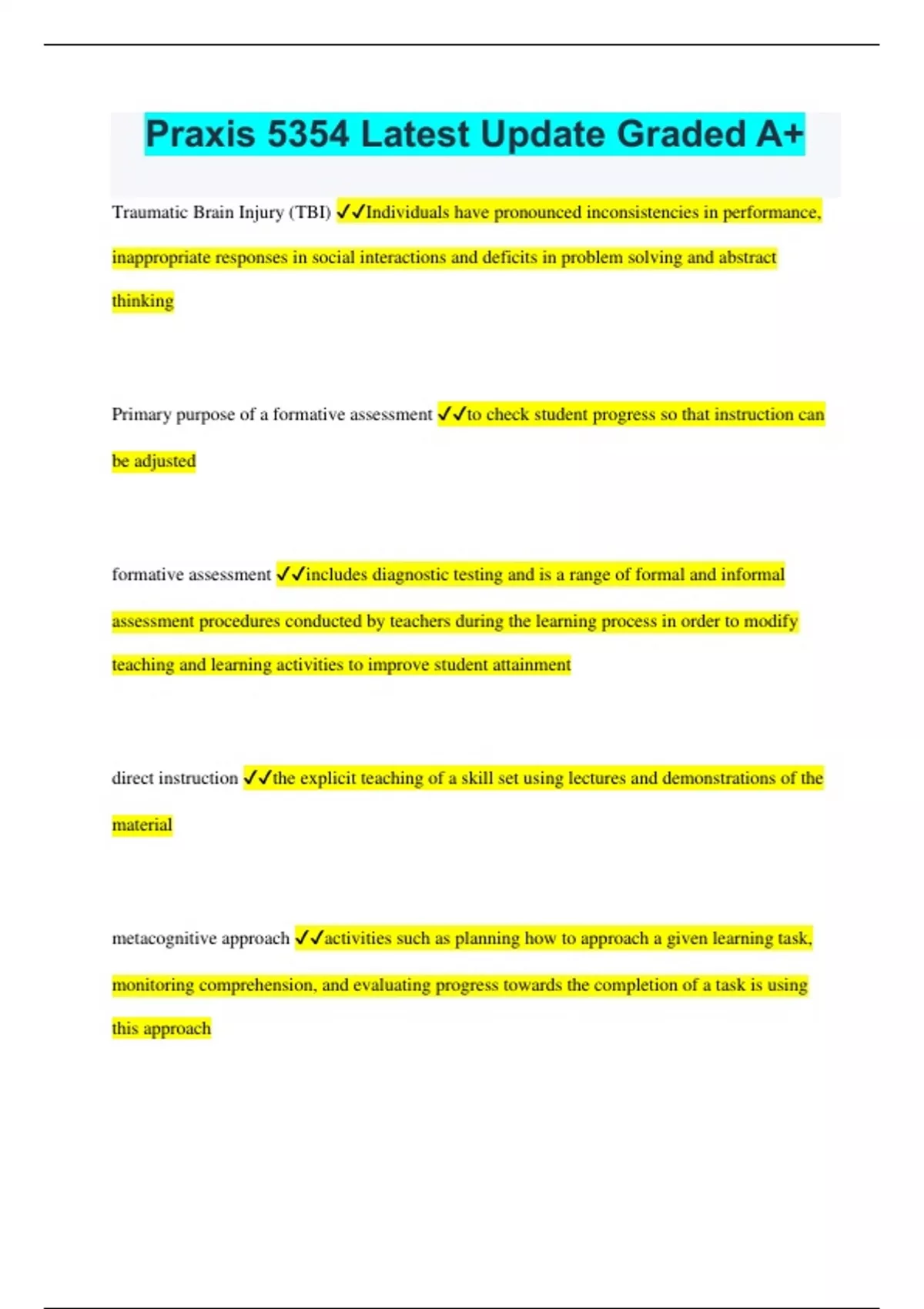 Praxis 5354 Latest Update Graded A+ Traumatic Brain Injury (TBI) Individuals have pronounced inconsistencies in performance, inappropriate responses in social interactions and deficits in problem solving and abstract thinking Primary purpose of a formative assessment to check student progress so that instruction can be adjusted formative assessment includes diagnostic testing and is a range of formal and informal assessment procedures conducted by teachers during the learning process in order to modify teaching and learning activities to improve student attainment direct instruction the explicit teaching of a skill set using lectures and demonstrations of the material metacognitive approach activities such as planning how to approach a given learning task, monitoring comprehension, and evaluating progress towards the completion of a task is using this approach diagnostic-prescriptive method identifies the strengths and weaknesses of each student, both cognitive and emotional structure, and establishes a teaching prescription of instruction cooperative learning a successful teaching strategy in which small teams, each with students of different levels of ability, use a variety of learning activities to improve their understanding of a subject How is a child identified as having an intellectual disability? Must have related limitations in two or more areas of adaptive skills and demonstrate significantly below average intellectual functioning adaptive skills necessary skills for functioning daily 10 adaptive skills 1) self care 2)communication skills 3)self-direction 4)social skills 5)leisure skills 6)home or school living 7)functional academics 8)community use 9)work 10)health and safety correct order of development of phonological awareness 1) Listening and rhyming 2) syllable awareness 3) onset and rime