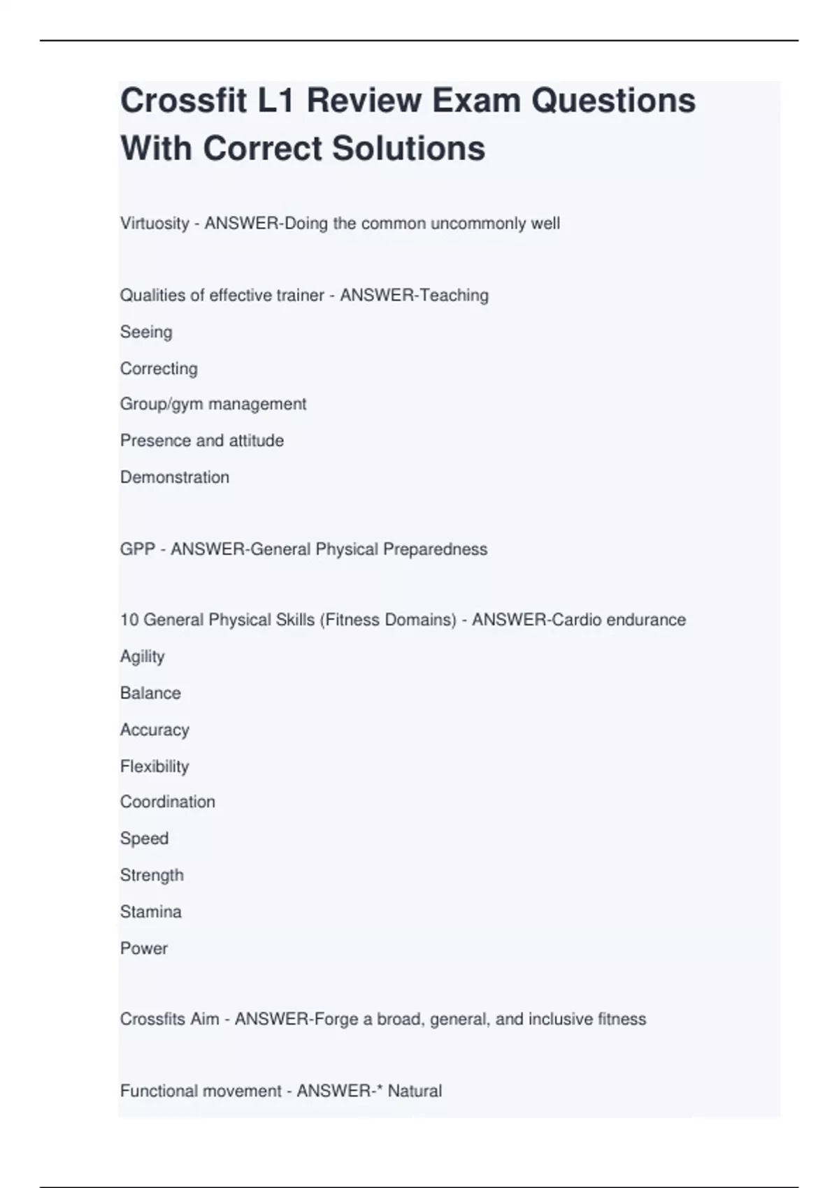 Crossfit L1 Review Exam Questions With Correct Solutions