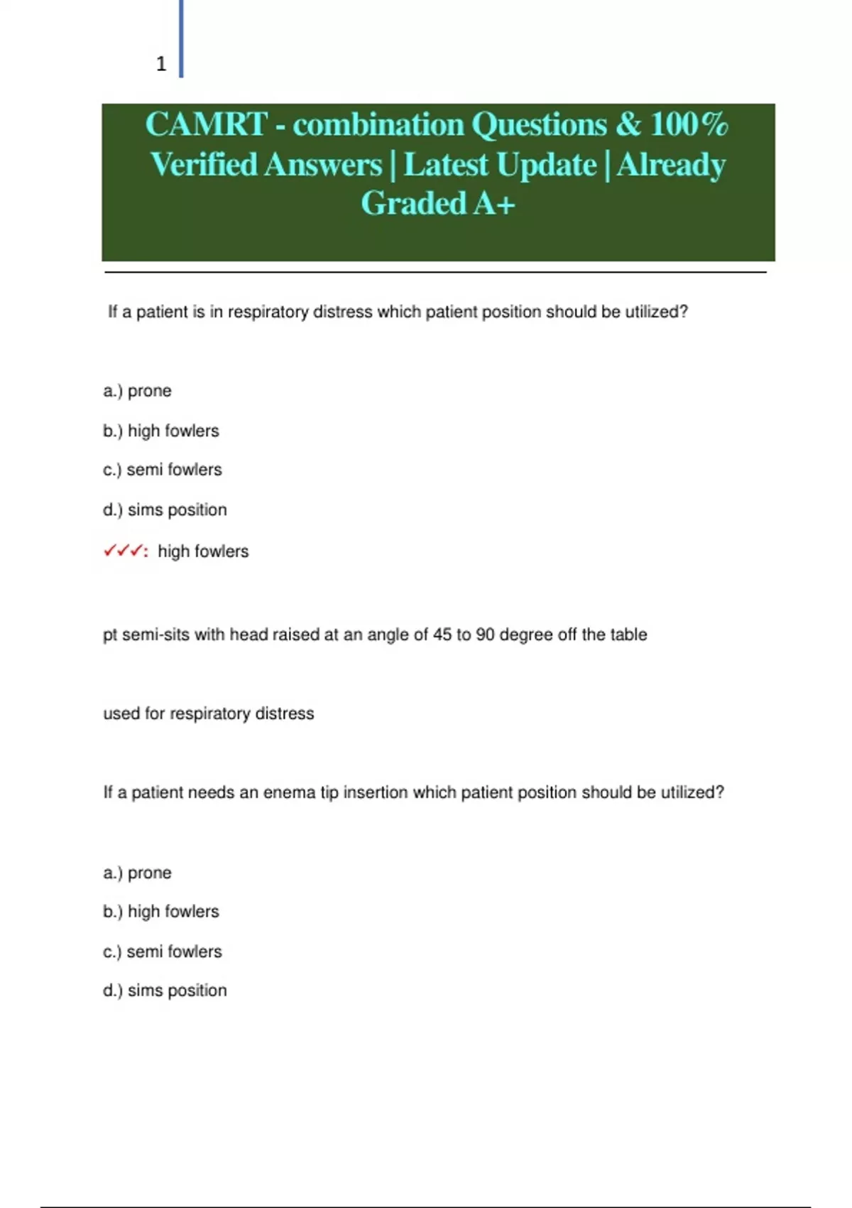 If a patient is in respiratory distress which patient position should be utilized? a.) prone b.) high fowlers c.) semi fowlers d.) sims position : high fowlers pt semi-sits with head raised at an angle of 45 to 90 degree off the table used for respiratory distress If a patient needs an enema tip insertion which patient position should be utilized? a.) prone b.) high fowlers c.) semi fowlers d.) sims position 2 : sims position the patient lies on either left or right side with the forward arm flexed and the posterior arm extended behind the body. the body is inclined slightly forward with the top knee bent sharply and the bottom knee slightly. This position is frequently used for diagnostic imaging of the lower bowel as an aid in inserting the enema tip If a patient needs improved venous return which patient position should be utilized? a.) prone b.) Trendelenburg c.) semi fowlers d.) sims position : Patients head is lower than the rest of their body used for promotion of venous return in patients with inadequate peripheral perfusion caused by disease What positions must a person with COPD avoid? from the list identify all that apply: -prone -trendelenburg -semi fowler