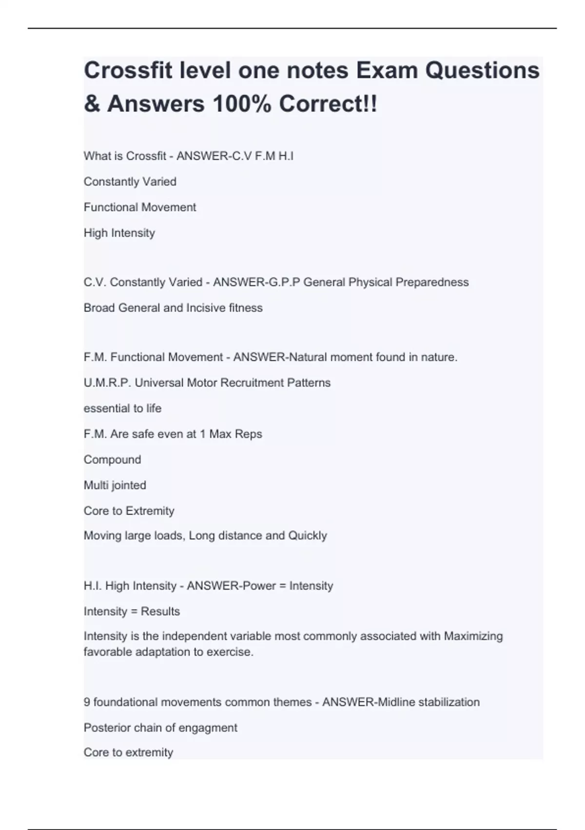 What is Crossfit - ANSWER-C.V F.M H.I Constantly Varied Functional Movement High Intensity C.V. Constantly Varied - ANSWER-G.P.P General Physical Preparedness Broad General and Incisive fitness F.M. Functional Movement - ANSWER-Natural moment found in nature. U.M.R.P. Universal Motor Recruitment Patterns essential to life F.M. Are safe even at 1 Max Reps Compound Multi jointed Core to Extremity Moving large loads, Long distance and Quickly H.I. High Intensity - ANSWER-Power = Intensity Intensity = Results Intensity is the independent variable most commonly associated with Maximizing favorable adaptation to exercise. 9 foundational movements common themes - ANSWER-Midline stabilization Posterior chain of engagment Core to extremity
