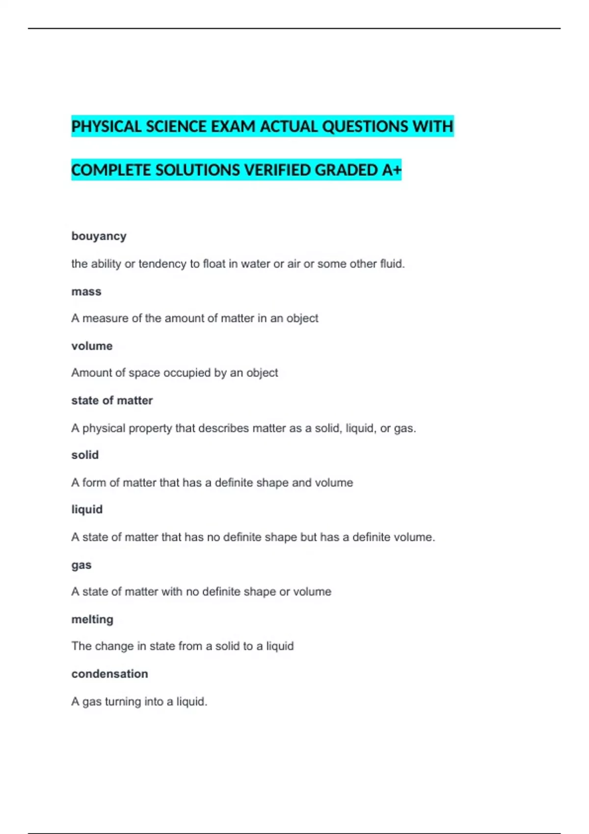PHYSICAL SCIENCE EXAM ACTUAL QUESTIONS WITH COMPLETE SOLUTIONS VERIFIED GRADED A+ bouyancy the ability or tendency to float in water or air or some other fluid. mass A measure of the amount of matter in an object volume Amount of space occupied by an object state of matter A physical property that describes matter as a solid, liquid, or gas. solid A form of matter that has a definite shape and volume liquid A state of matter that has no definite shape but has a definite volume. gas A state of matter with no definite shape or volume melting The change in state from a solid to a liquid condensation A gas turning into a liquid.