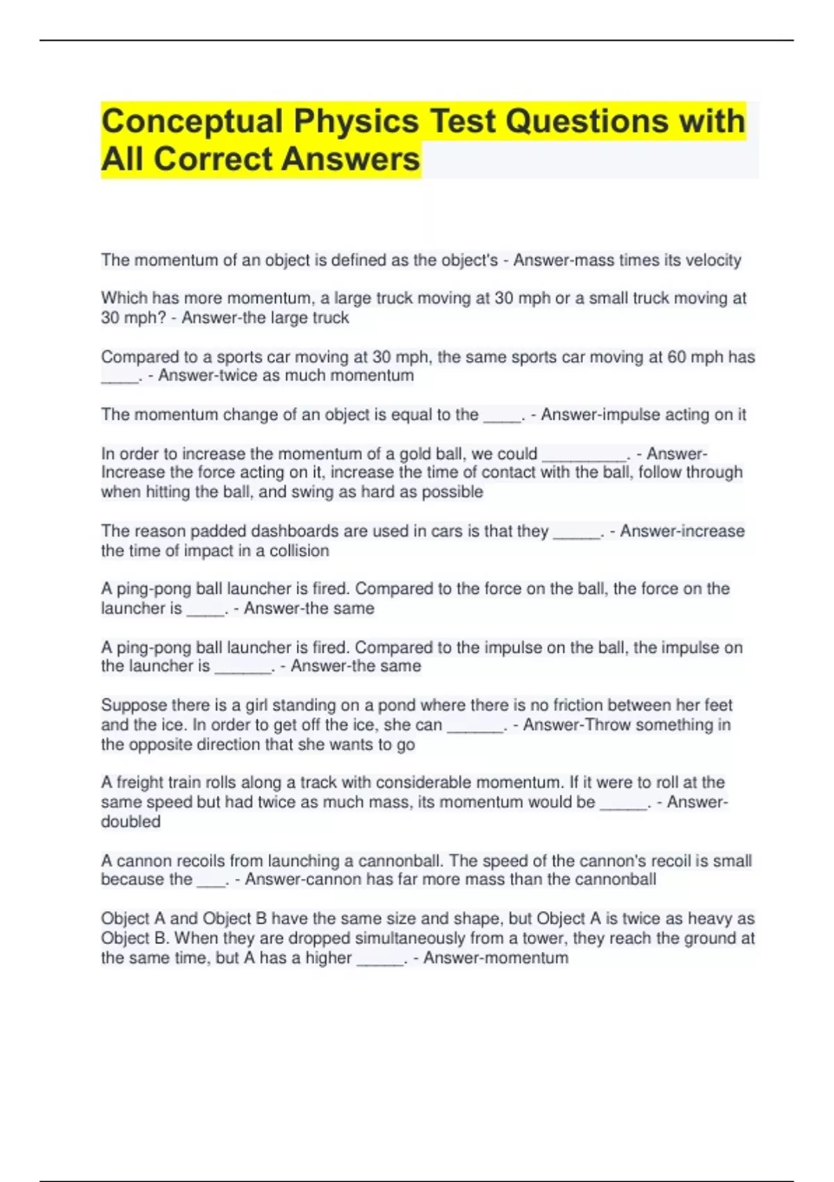 Conceptual Physics Test Questions with All Correct Answers The momentum of an object is defined as the object's - Answer-mass times its velocity Which has more momentum, a large truck moving at 30 mph or a small truck moving at 30 mph? - Answer-the large truck Compared to a sports car moving at 30 mph, the same sports car moving at 60 mph has ____. - Answer-twice as much momentum The momentum change of an object is equal to the ____. - Answer-impulse acting on it In order to increase the momentum of a gold ball, we could _________. - AnswerIncrease the force acting on it, increase the time of contact with the ball, follow through when hitting the ball, and swing as hard as possible The reason padded dashboards are used in cars is that they _____. - Answer-increase the time of impact in a collision A ping-pong ball launcher is fired. Compared to the force on the ball, the force on the launcher is ____. - Answer-the same A ping-pong ball launcher is fired. Compared to the impulse on the ball, the impulse on the launcher is ______. - Answer-the same Suppose there is a girl standing on a pond where there is no friction between her feet and the ice. In order to get off the ice, she can ______. - Answer-Throw something in the opposite direction that she wants to go A freight train rolls along a track with considerable momentum. If it were to roll at the same speed but had twice as much mass, its momentum would be _____. - Answerdoubled A cannon recoils from launching a cannonball. The speed of the cannon's recoil is small because the ___. - Answer-cannon has far more mass than the cannonball Object A and Object B have the same size and shape, but Object A is twice as heavy as Object B. When they are dropped simultaneously from a tower, they reach the ground at the same time, but A has a higher _____. - Answer-momentum In order to catch a ball, a baseball player moves his or her hand backward in the direction of the ball's motion. Doing this reduces the force of impact on the players hand principally because ____. - Answer-the time of impact is increased A cannon fires a cannonball. The speed of the cannonball will be the same as the speed of the recoiling cannon ___. - Answer-if the mass of the cannonball equals the mass of the cannon