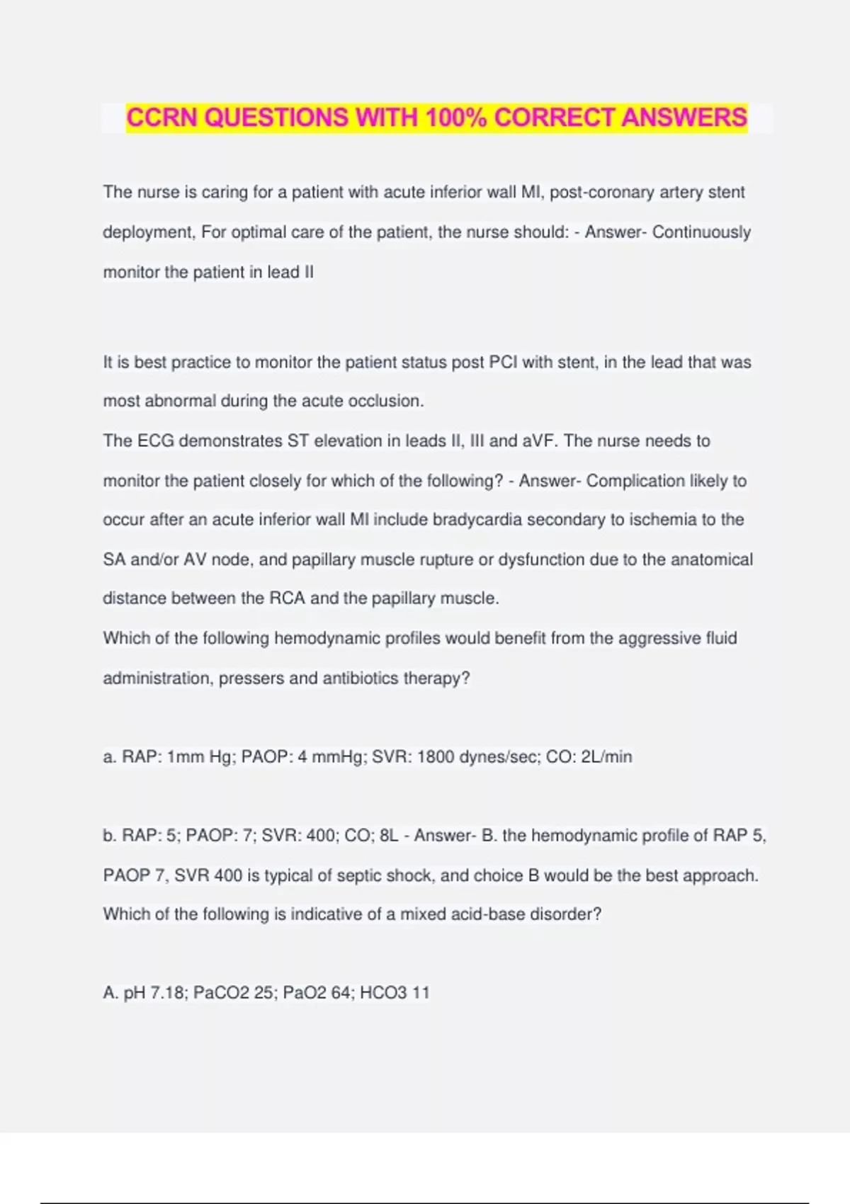 CCRN QUESTIONS WITH 100% CORRECT ANSWERS The nurse is caring for a patient with acute inferior wall MI, post-coronary artery stent deployment, For optimal care of the patient, the nurse should: - Answer- Continuously monitor the patient in lead II It is best practice to monitor the patient status post PCI with stent, in the lead that was most abnormal during the acute occlusion. The ECG demonstrates ST elevation in leads II, III and aVF. The nurse needs to monitor the patient closely for which of the following? - Answer- Complication likely to occur after an acute inferior wall MI include bradycardia secondary to ischemia to the SA and/or AV node, and papillary muscle rupture or dysfunction due to the anatomical distance between the RCA and the papillary muscle. Which of the following hemodynamic profiles would benefit from the aggressive fluid administration, pressers and antibiotics therapy? a. RAP: 1mm Hg; PAOP: 4 mmHg; SVR: 1800 dynes/sec; CO: 2L/min b. RAP: 5; PAOP: 7; SVR: 400; CO; 8L - Answer- B. the hemodynamic profile of RAP 5, PAOP 7, SVR 400 is typical of septic shock, and choice B would be the best approach. Which of the following is indicative of a mixed acid-base disorder? A. pH 7.18; PaCO2 25; PaO2 64; HCO3 11 B. pH 7.33; PaCO2 29; PaO2 72; HCO3 15 - Answer- The decrease in PaCO2 is evidence of respiratory alkalosis and the decreased HCO3 is evidenced of a metabolic acidosis. The pt with severe sepsis or septic shock may present with this mixed acid- base disorder. The patient with a temporary pacemaker develops pacemaker malfunction. The oriented is instructed to reposition the patient to try and correct the problem. The cardiac monitor most likely demonstrates? - Answer- Failure to capture (pacemaker without a QRS) may be corrected by repositioning the patient to the side. The patient with diastolic heart develops SVT, heart rate 220/min. The most dangerous hemodynamic effect is a decrease in: - Answer- coronary artery perfusion. Diastolic heart failure results in a problem with left ventricular FILLING secondary to ventricular thickening, and contractility and ejection are maintained in diastolic failure. The rapid heart rate will decrease filling time, worsen left ventricular filling and because coronary artery perfusion occurs during diastole, this arrhythmia may be life-threatening. The patient is receiving heparin infusion for the treatment of pulmonary embolism. There has been a 60% decrease in the platelet count and no clinical change. Which of the following is indicated? - Answer- Discontinue heparin and being argatroban. The patient most likely has HIT. Exposure to heparin needs to discontinued and a direct thrombin inhibitor started for continued anticoagulation. The patient with oat cell carcinoma has the following clinical findings: low urine output, low serum osmolality, hyponatremia, and elevated urine sodium. The nurse anticipates which of the following as part of the treatment plan? - Answer- Phenytoin (Dilantin), 3% saline. The patient has signs of SIADH which results in production of excessive ADH. Dilantin will inhibit ADH secretion and 3% saline will increase serum sodium. Peep therapy and mechanical ventilation are ordered for the patient with acute respiratory failure. Which of the following is a possible complication? - Answer- Barotrauma The addition of positive end-expiratory pressure will increase alveolar recruitment, prevent atelectasis and improve oxygenation. However, the increase in intrathoracic pressure may lead to pneumothorax or subcutane