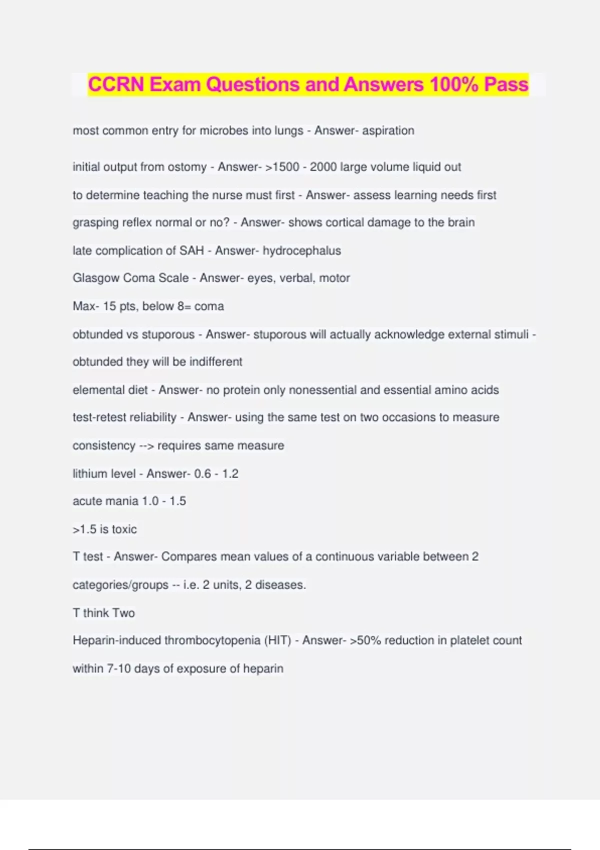 CCRN Exam Questions and Answers 100% Pass most common entry for microbes into lungs - Answer- aspiration initial output from ostomy - Answer- > large volume liquid out to determine teaching the nurse must first - Answer- assess learning needs first grasping reflex normal or no? - Answer- shows cortical damage to the brain late complication of SAH - Answer- hydrocephalus Glasgow Coma Scale - Answer- eyes, verbal, motor Max- 15 pts, below 8= coma obtunded vs stuporous - Answer- stuporous will actually acknowledge external stimuli - obtunded they will be indifferent elemental diet - Answer- no protein only nonessential and essential amino acids test-retest reliability - Answer- using the same test on two occasions to measure consistency --> requires same measure lithium level - Answer- 0.6 - 1.2 acute mania 1.0 - 1.5 >1.5 is toxic T test - Answer- Compares mean values of a continuous variable between 2 categories/groups -- i.e. 2 units, 2 diseases. T think Two Heparin-induced thrombocytopenia (HIT) - Answer- >50% reduction in platelet count within 7-10 days of exposure of heparin -Severe form results in global thromboembolism due to immune reaction with platelet factor 4 Monophasic defibrillator - Answer- single shock - 360 joules mitral valve regurgitation causes - Answer- L atrium and ventricle dilation and hypertrophy how long to continue heparin waiting for warfarin - Answer- 5 - 7 days pre cancerous findings colonoscopy - Answer- adenomatous polyps periumbilical ecchymosis - Answer- referred to as Cullen sign and may take hours or days to develop following abdominal trauma can show retroperitoneal bleeding or acute pancreatitis Situational Leadership Theory - Answer- This theory focused on a follower's competence and commitment, or development level (DL) in completing a specific task and the use of four different leadership styles to influence the follower's development. These styles are directive, coaching, supporting, or delegating. Papillary muscle rupture - Answer- post mi complication sodium nitroprusside and IABP needed max inflate for pa cath - Answer- 1.5 ml pa cath should be ____ from the mediastinum - Answer- 5 mm the elderly can't see _____________ colors - Answer- blue/green/violet hypertensive crisis how fast to decrease - Answer- initial bp drop by 25% in mins - hour NIF < _____ INTUBATE - Answer- 20 FVC (forced vital capacity) - Answer- The amount of air forcefully expired after a maximal inspiration pulsus paradoxus - Answer- cardiac tamponade what drugs can lead to pulmonary disease - Answer- B blockers Nsaids NAC histamine when can you not use streptokinase - Answer- with recent strep infection Phenytoin can only be mixed with - Answer- normal saline - anticonvulsant small trachea perf treatemetn - Answer- can heal on their own - intubate for safety (ETT cuff inferior to perf) organ donor lab values - Answer- hematocrit >30% platelets > 80k INR <2 best cardiac marker - Answer- troponin I collagen plug for cath how long bedrest - Answer- 1-2 hours primary pneumothorax common in - Answer- males 10-30 smokers rewarming post op medication to stop shiver - Answer- meperidine