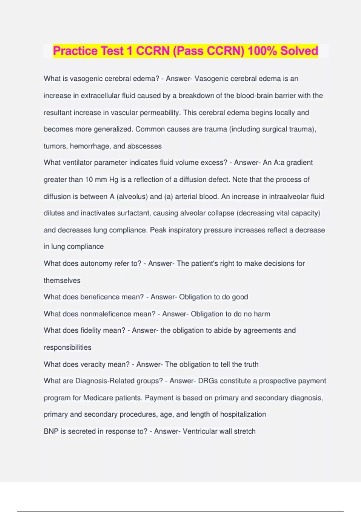 Practice Test 1 CCRN (Pass CCRN) 100% Solved What is vasogenic cerebral edema? - Answer- Vasogenic cerebral edema is an increase in extracellular fluid caused by a breakdown of the blood-brain barrier with the resultant increase in vascular permeability. This cerebral edema begins locally and becomes more generalized. Common causes are trauma (including surgical trauma), tumors, hemorrhage, and abscesses What ventilator parameter indicates fluid volume excess? - Answer- An A:a gradient greater than 10 mm Hg is a reflection of a diffusion defect. Note that the process of diffusion is between A (alveolus) and (a) arterial blood. An increase in intraalveolar fluid dilutes and inactivates surfactant, causing alveolar collapse (decreasing vital capacity) and decreases lung compliance. Peak inspiratory pressure increases reflect a decrease in lung compliance What does autonomy refer to? - Answer- The patient's right to make decisions for themselves What does beneficence mean? - Answer- Obligation to do good What does nonmaleficence mean? - Answer- Obligation to do no harm What does fidelity mean? - Answer- the obligation to abide by agreements and responsibilities What does veracity mean? - Answer- The obligation to tell the truth What are Diagnosis-Related groups? - Answer- DRGs constitute a prospective payment program for Medicare patients. Payment is based on primary and secondary diagnosis, primary and secondary procedures, age, and length of hospitalization BNP is secreted in response to? - Answer- Ventricular wall stretch What are omnious signs in a patient with status asthmaticus? - Answer- A normalization or increase in the PaCO2. This patient is still tachypneic, and if ventilation is normal, PaCO2 should be decreased. The other ominous sign in this patient would be absence of wheezing or rhonchi, because they would indicate that ventilation is insufficient to cause these noises. What problems arise from losses from the GI tract? - Answer- Any loss results in hypokalemia. Vomiting results in loss of acidic contents, whereas losses below the pylorus result is alkalitic losses leading to metabolic acidosis. Fluid is sequestered in the intestine leading to hypovolemia, which could cause hypovolemic shock. Actual problems are worse than potential problems!! - Answer- How can you differentiate the cause of jaundice? - Answer- An increase in direct bilirubin is associated with biliary obstruction because direct bilirubin is conjugated. An increase in indirect bilirubin is associated with hepatic disease or excessive hemolysis because indirect bilirubin is unconjugated What antihypertensive meds work best in African american patients? - Answer- African- Americans do not respond well to angiotensin-converting enzyme inhibitors (e.g., captopril [Capoten]), but they do respond well to an angiotensin II blocker (valsartan [Diovan]). Of the beta-blockers, labetalol works best. Of the calcium channel blockers, diltiazem works best What lab values define acute respiratory failure? - Answer- 50-50! PaO2<50 and/or PaCO2>50 Hyperkalemia can cause what? - Answer- Diarrhea-increases gastric motility Flaccid paralysis- partially depolarizes muscle cells, prevents further depolarization Every 1 inch increase in abdominal girth equates to how much blood accumulation in the abdomen - Answer- 500-1000mL What pacing method would be used in a patient in atri