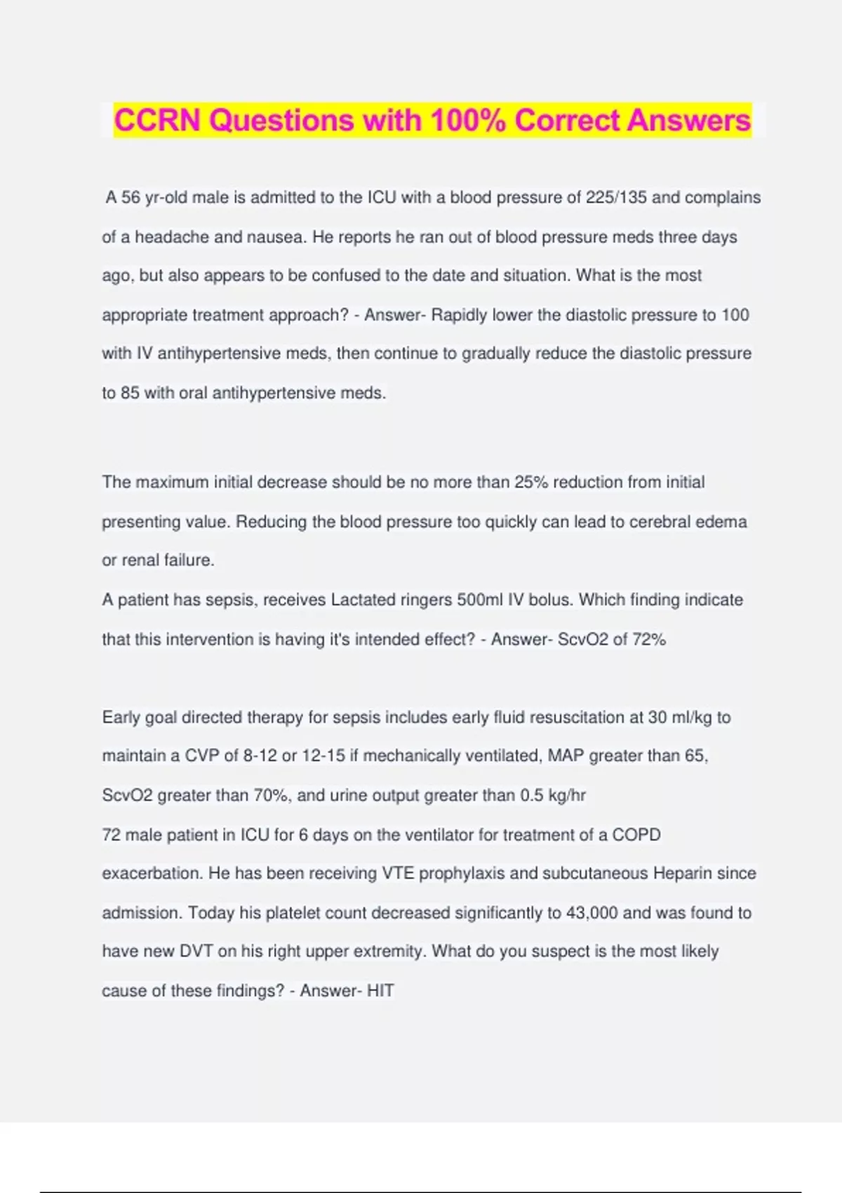 CCRN Questions with 100% Correct Answers A 56 yr-old male is admitted to the ICU with a blood pressure of 225/135 and complains of a headache and nausea. He reports he ran out of blood pressure meds three days ago, but also appears to be confused to the date and situation. What is the most appropriate treatment approach? - Answer- Rapidly lower the diastolic pressure to 100 with IV antihypertensive meds, then continue to gradually reduce the diastolic pressure to 85 with oral antihypertensive meds. The maximum initial decrease should be no more than 25% reduction from initial presenting value. Reducing the blood pressure too quickly can lead to cerebral edema or renal failure. A patient has sepsis, receives Lactated ringers 500ml IV bolus. Which finding indicate that this intervention is having it's intended effect? - Answer- ScvO2 of 72% Early goal directed therapy for sepsis includes early fluid resuscitation at 30 ml/kg to maintain a CVP of 8-12 or 12-15 if mechanically ventilated, MAP greater than 65, ScvO2 greater than 70%, and urine output greater than 0.5 kg/hr 72 male patient in ICU for 6 days on the ventilator for treatment of a COPD exacerbation. He has been receiving VTE prophylaxis and subcutaneous Heparin since admission. Today his platelet count decreased significantly to 43,000 and was found to have new DVT on his right upper extremity. What do you suspect is the most likely cause of these findings? - Answer- HIT The hallmark sign of HIT is a significant decrease in platelet count over a 24 hours period (>50%) within 5-10 days of administering Heparin. The other hallmark sign is a new development of DVT despite being on VTE prophylaxis. TRALI: - Answer- is a complication from a blood transfusion reaction, which causes acute lung injury typically within 6 hours of a blood transfusion. 2 Hallmark signs of HIT: - Answer- Decrease in platelet count over a 24 hr period. New development of DVT despite being on VTE prophylaxis. Values in Early compensated Hypovolemic shock? - Answer- CO 4.0 L/min, HR 135, SV 65, SVR 1700, MAP 65 In hypovolemic states, circulating volume is depleted therefore preload and contractility are decreased which leads to a decrease in SV and CO. HR and SV increase as compensatory measure to preserve CO, MAP and cerebral perfusion. Post-renal failure values: - Answer- Urine output < 200; urine sodium 30; BUN: Creatinine ratio 15:1; urine specific gravity 1.010 BUN: Creatinine ratio is 15:1, but both the BUN & creatinine are elevated. Urine sodium is typically 1-40 mEq/L. What to do in the event of HIT: - Answer- Stop Heparin and administer an alternative direct thrombin inhibitor. Warfarin is contraindicated in HIT? T/F - Answer- True - there is also no evidence that shows protamine, corticosteroids, and benadryl are effective treatments for HIT Patients with right ventricular infarctions become preload dependent. Meds that decrease preload should be avoided - which meds are these? - Answer- Morphine, Nitro, Beta blockers and diuretics. Polymorphic ventricular tachycardia aka Torsades is treated by? - Answer- Magnesium Myocardial contusions generally impact which parts of the heart? and what would the values be? - Answer- Atria & right ventricle because of the position of the heart in the chest. PAOP 6, PA Pressure 40/24, RA Pressure 16 Neurogenic shock signs? - Answer- CVP: 3, CI: 2.5, SVR: 650, SBP: 88 Neuro shock is associated with a loss of sympathetic tone causing extensive peripheral vasodilation. Clinical signs and symptoms include hypotension, a low SVR, low CVP and low normal CI What causes a larger than normal A wave on a PAOP? - Answer- Mitral stenosis - causes increased left atrial pressure during atrial contraction. Pulmonary HTN will result in what? - Answer- Elevated PA pressures but have no impact on PAOP. Infective Endocarditis can cause what kind of impairment? - Answer- Neurologic impairment. One of the risks of infective endocarditis is the bacterial strand breaking in the heart and throwing bacterial emboli forward into the lungs from the right side of the heart or to the brain/body from the left side of the heart. Neurologic impairment could be a sign? - Answer- Embolic ischemic stroke. Post bariatric surgery should avoid what kind of meds? - Answer- Extended release meds due to absorption concerns post-operatively Chlorpropamide is a what? - Answer- sulfonylurea drug that is used in DI as an antidiuretic. It is primarily a glucose lowering agent. (hypoglycemia) Will a cardiac transplant patient respond to atropine? - Answer- No - pacing is the best instrument for symptomatic bradycardia. Elevated urine osmolality; decreased serum osmolality; and decreased serum sodium is what symptom? - Answer- SIADH - causes retention of water. Urine production is minimal and concentrated & leads to an increased urine osmolality. What does Neo drug increase? - Answer- SVR - Peripheral constriction Treatment for narrow complex, regular rhythm? - Answer- Administer 6mg adenosine rapidly IVP Half life of metformin? - Answer- 6 hours - close monitoring is required to ensure the blood glucose level does not climb too quickly while dextrose is being administered. Most accurate reflection of daily fluid balance? - Answer- Record a daily weight at the same time each day. Wide mediastinum on chest x-ray, narrow pulse pressure, and hypotension are signs of what? - Answer- Cardiac tamponade A patient with hyponatremia would need what? - Answer- Help maintaining a safe environment. HypoNa impairs judgment, and causes confusion. Peritoneal dialysis works on the principles of both? - Answer- Diffusion and osmosis. HHNS leads to what? - Answer- Large fluid deficits and may require multiple liters of fluid, which is determined by the patient's level of dehydration and hyperosmolality. What parameters are consistent with Pulsus Paradoxes? - Answer- Decrease in SBP>10 during inspiration. Before administering rtPA what must happen? - Answer- Lower the BP to at least 1
