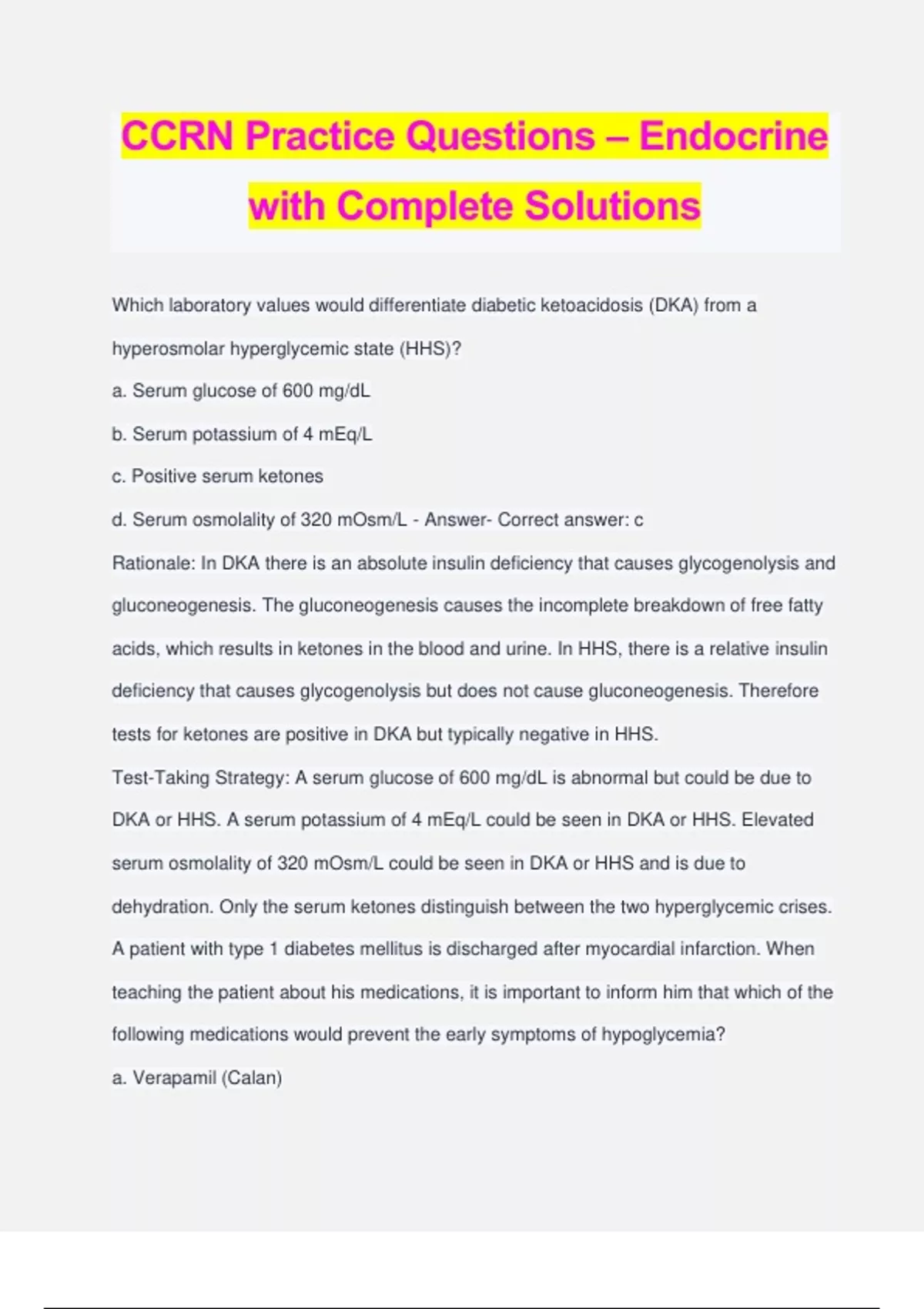 CCRN Practice Questions – Endocrine with Complete Solutions Which laboratory values would differentiate diabetic ketoacidosis (DKA) from a hyperosmolar hyperglycemic state (HHS)? a. Serum glucose of 600 mg/dL b. Serum potassium of 4 mEq/L c. Positive serum ketones d. Serum osmolality of 320 mOsm/L - Answer- Correct answer: c Rationale: In DKA there is an absolute insulin deficiency that causes glycogenolysis and gluconeogenesis. The gluconeogenesis causes the incomplete breakdown of free fatty acids, which results in ketones in the blood and urine. In HHS, there is a relative insulin deficiency that causes glycogenolysis but does not cause gluconeogenesis. Therefore tests for ketones are positive in DKA but typically negative in HHS. Test-Taking Strategy: A serum glucose of 600 mg/dL is abnormal but could be due to DKA or HHS. A serum potassium of 4 mEq/L could be seen in DKA or HHS. Elevated serum osmolality of 320 mOsm/L could be seen in DKA or HHS and is due to dehydration. Only the serum ketones distinguish between the two hyperglycemic crises. A patient with type 1 diabetes mellitus is discharged after myocardial infarction. When teaching the patient about his medications, it is important to inform him that which of the following medications would prevent the early symptoms of hypoglycemia? a. Verapamil (Calan) b. Diazepam (Valium) c. Metoprolol (Lopressor) d. Humulin insulin - Answer- Correct answer: c Rationale: The early symptoms of hypoglycemia are mediated by the sympathetic nervous system. Sympathetic blocking agents would block these symptoms. Metoprolol (Lopressor) is a beta-blocker, which would block the tachycardia, nervousness, and diaphoresis indicative of early hypoglycemia. Test-Taking Strategy: Think "prevent equals block." Option a is a calcium channel blocker, and option c is a beta-blocker. Remember that beta in beta-blocker refers to the receptors of the sympathetic nervous system and that the early indications of hypoglycemia are sympathetic nervous system symptoms. Choose option c A patient received Humulin NPH insulin at 7 AM. He was nauseated and vomiting at lunchtime and did not eat. It is now 3 PM. What are the early signs of hypoglycemia for which the nurse should monitor? a. Decreased skin turgor; abdominal pain; fever b. Tachycardia; tachypnea; diaphoresis c. Thirst; hypotension; fruity odor to breath d. Flushed skin; confusion; rapid, deep breathing - Answer- Correct answer: b Rationale: The early signs of hypoglycemia are mediated by the sympathetic nervous system, which acts to mobilize glucose stores. Later signs of hypoglycemia are related to low glucose levels in the brain (neuroglycopenia). Test-Taking Strategy: Remember that sympathetic nervous system innervation occurs in any physiologic stressor. Because the question says "early," choose the option that identifies sympathetic nervous system signs. Choose option b. A patient received Humulin NPH insulin at 7 AM. He was nauseated and vomiting at lunchtime and did not eat. If this patient develops manifestations of hypoglycemia, treatment would include: a. 25 mL of 50% dextrose in water (D50W). b. glucagon intramuscularly. c. 4 oz of apple juice. d. 100 mL of 5% dextrose in water (D5W). - Answer- Correct answer: a Rationale: The treatment for mild hypoglycemia is 10 to 15 g of carbohydrates. This normally is administered as 4 oz of orange juice if the patient can drink (unless the patient has renal failure when lower potassium, lower water options are better). This patient has not been able to take anything by mouth all day. Glucagon is a hormone that mobilizes glucose from glucose stores but takes longer than directly giving glucose. D5W has 5 g of dextrose per 100 mL, which would provide only 20 calories. D50W has 50 g of dextrose per 100 mL. A volume of 25 mL of D50W would provide 12.5 g of carbohydrate and 50 calories. Test-Taking Strategy: The case presentation is a hypoglycemic patient who is unable to take food by mouth, so eliminate option c. Glucagon should be used only if intravenous administration of glucose is not possible, so eliminate option b. Administration of 100 mL of D5W would provide less than the recommended carbohydrate dosage for mild hypoglycemia. Choose option a. A 25-year-old woman is admitted with diabetic ketoacidosis (DKA). The following laboratory values were reported from blood taken at admission: Serum glucose 450 mg/dL Potassium 4.5 mEq/L pH 7.15 She has received regular insulin bolus, and an infusion has been initiated. Two liters of normal saline has been administered. The last serum glucose is 215 mg/dL, and the pH is 7.32. Which therapy would be inappropriate? a. Changing the intravenous solution to include dextrose b. Adding potassium to the intravenous solution c. Administering sodium bicarbonate d. Slowing the insulin infusion - Answer- Correct answer: c Rationale: Treatment of metabolic acidosis is first of all treatment of the cause. The acidosis in DKA is caused by an insulin deficiency and should be treated with insulin therapy and rehydration. Sodium bicarbonate generally is reserved for pH of 7 or less. Dextrose should be added to the intravenous solution when the serum glucose is less than 250 mg/dL. The serum potassium is normal on admission only because the patient is acidotic and potassium is shifted out of the cell and into the serum. As soon as the pH is corrected, the potassium will shift back into the cell and the serum potassium will drop and need to be replaced. As the serum glucose comes down, the insulin infusion should be adjusted. Test-Taking Strategy: The pH is very close to normal, and sodium bicarbonate is reserved for severely acidotic states A patient had a craniotomy 2 days ago for removal of a tumor. He is awake and talking to the nurse and demonstrates no neurologic deficit. Blood pressure is 110/80 mm Hg, pulse is 92 beats/min, and respiratory rate is 22 breaths/min. Urine outputs have been approximately 60 mL/hr over the last 2