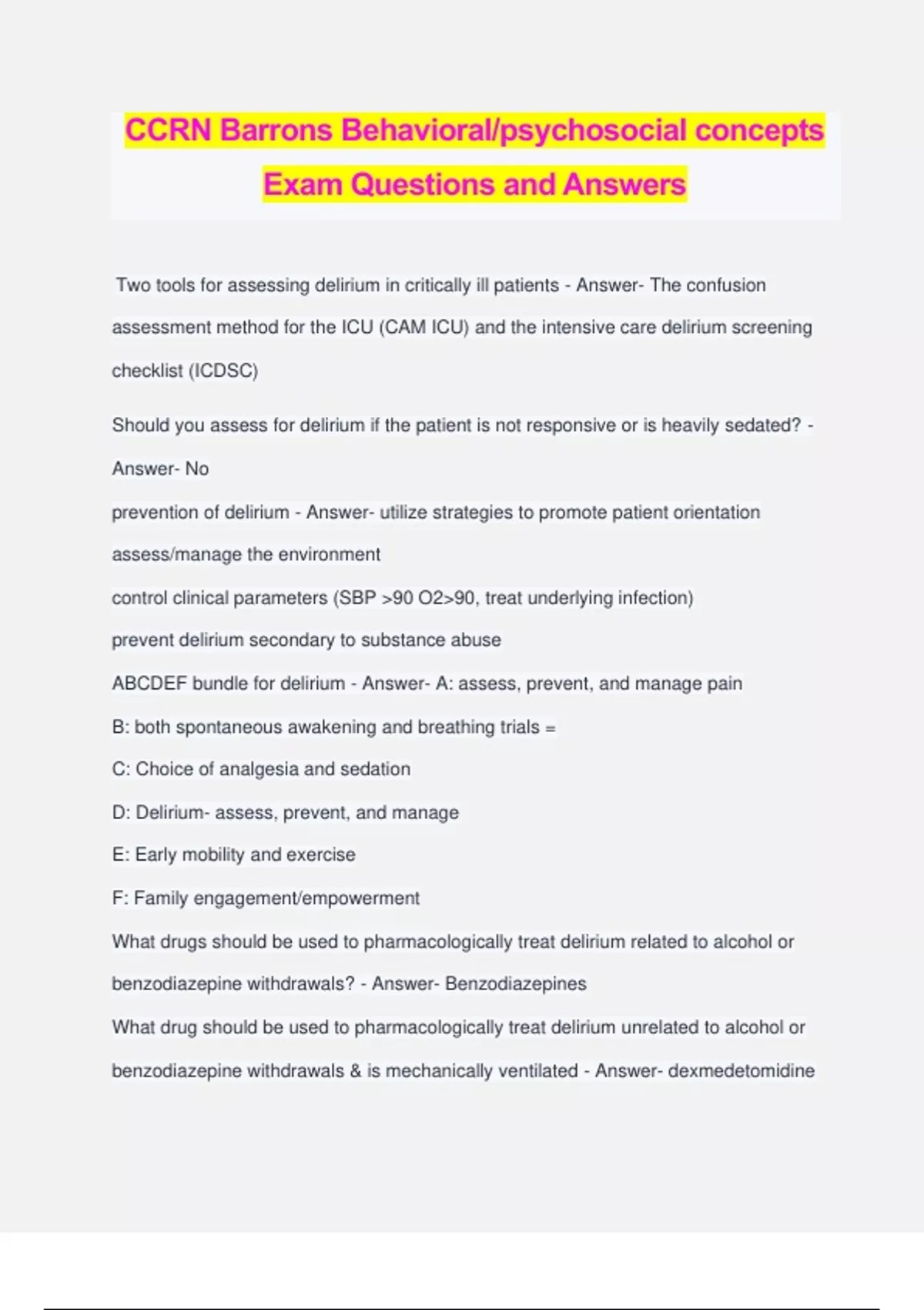 CCRN Barrons Behavioral/psychosocial concepts Exam Questions and Answers Two tools for assessing delirium in critically ill patients - Answer- The confusion assessment method for the ICU (CAM ICU) and the intensive care delirium screening checklist (ICDSC) Should you assess for delirium if the patient is not responsive or is heavily sedated? - Answer- No prevention of delirium - Answer- utilize strategies to promote patient orientation assess/manage the environment control clinical parameters (SBP >90 O2>90, treat underlying infection) prevent delirium secondary to substance abuse ABCDEF bundle for delirium - Answer- A: assess, prevent, and manage pain B: both spontaneous awakening and breathing trials = C: Choice of analgesia and sedation D: Delirium- assess, prevent, and manage E: Early mobility and exercise F: Family engagement/empowerment