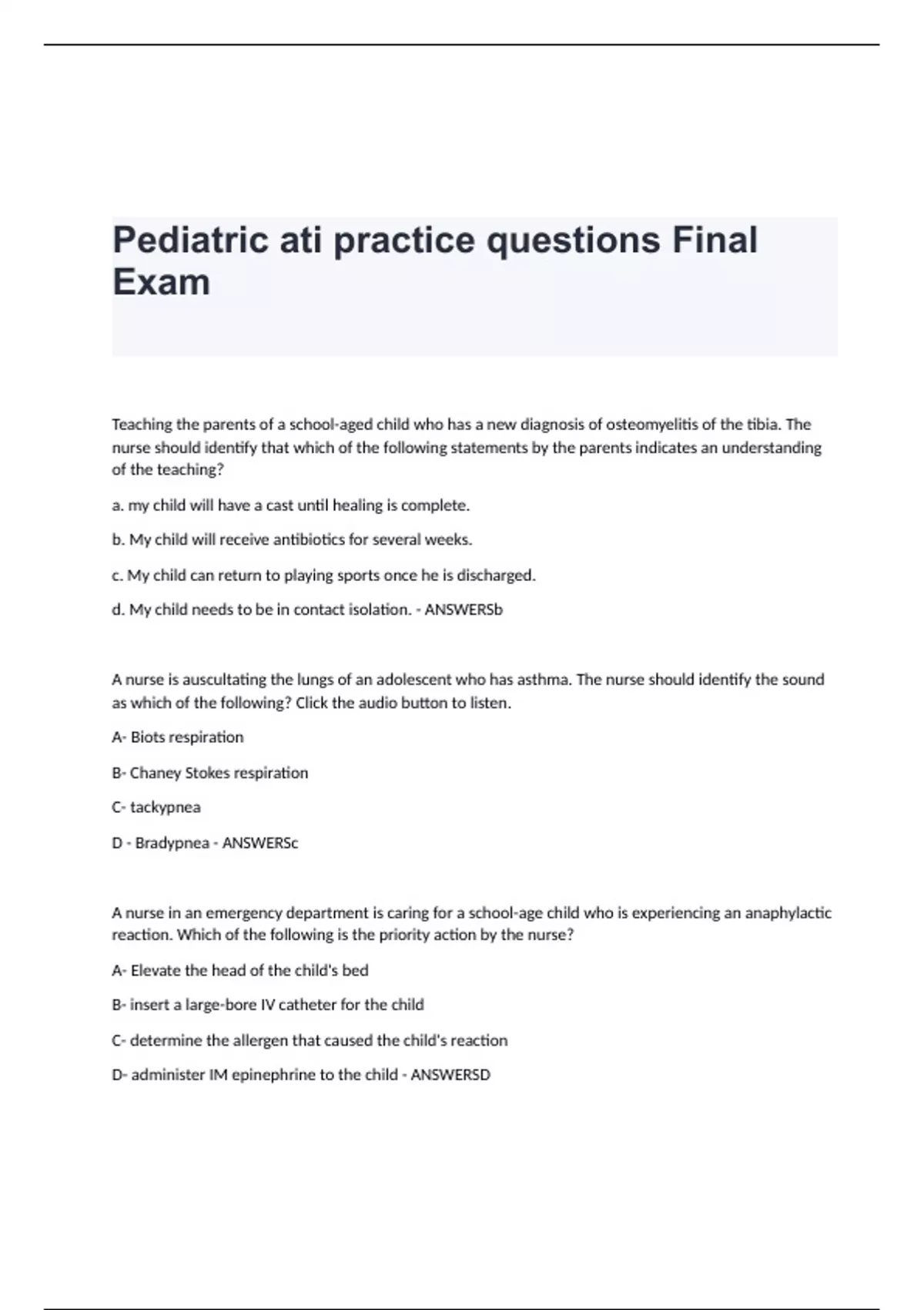Teaching the parents of a school-aged child who has a new diagnosis of osteomyelitis of the tibia. The nurse should identify that which of the following statements by the parents indicates an understanding of the teaching? a. my child will have a cast until healing is complete. b. My child will receive antibiotics for several weeks. c. My child can return to playing sports once he is discharged. d. My child needs to be in contact isolation. - ANSWERSb A nurse is auscultating the lungs of an adolescent who has asthma. The nurse should identify the sound as which of the following? Click the audio button to listen. A- Biots respiration B- Chaney Stokes respiration C- tackypnea D - Bradypnea - ANSWERSc A nurse in an emergency department is caring for a school-age child who is experiencing an anaphylactic reaction. Which of the following is the priority action by the nurse? A- Elevate the head of the child's bed B- insert a large-bore IV catheter for the child C- determine the allergen that caused the child's reaction D- administer IM epinephrine to the child - ANSWERSD The nurse is preparing to administer an immunization to a four-year-old child. Which of the following actions should the nurse plan to take? A- Place the child in a prone position for the immunization B- request that the child's caregiver leave the room during the immunization C- administer the immunization using a 24 gauge needle D- inject the immunization slowly after aspirating for 3 seconds - ANSWERSC A nurse is reviewing the laboratory report of an infant who is receiving treatment for severe dehydration. The nurse should identify which of the following laboratory values indicates effectiveness of the current treatment? A- Potassium 2.9 mEq/L B- sodium 140 C- urine specific gravity 1.035 D- BUN 25 mg - ANSWERSb The nurse is providing teaching about Social Development to the parents of a preschooler. Which of the following play activities should the nurse recommend for the child? A- Play pat-a-cake B- using a push pull toy C- creating a scrapbook D- playing dress-up - ANSWERSD A nurse is teaching the parents of a newborn about ways to prevent sudden infant death syndrome SIDS. Which of the following instructions should the nurse include? A- Place the infant in a prone position to sleep. B- Allow the infant to sleep on a large pillow. C- User soft mattress in the infant's crib. D- Give the infant a pacifier at bedtime. - ANSWERSd A nurse is assessing an infant who has pneumonia. Which of the following findings is the priority for the nurse to report to the provider? A- Nasal flaring B- WBC 11,300 C- diarrhea D- abdominal distension - ANSWERSa A school nurse is assessing a school-age child blood pressure while he is seated in a chair. The child starts to experience a tonic-clonic seizure. Which of the following actions should the nurse take first? A- Clear the immediate area around the child of hazardous objects B- loosen the child restrictive clothing C- assist the child to a side-lying position on the floor D- apply an oxygen mask to the child - ANSWERSc A nurse is preparing to administer ibuprofen 5 mg per kg every 6 hours PRN for temperatures above 38.0 degrees Celsius or 100.5 degrees Fahrenheit to an infant who weighs 17.6 lb. The infant has a temperature of 38.4 degrees Celsius or 100 + 1.2 degrees Fahrenheit. Available is ibuprofen liquid 100mg/ 5 ml. how many milliliters should the nurse administer to the infant per dose? Round the answer to the nearest whole number. Use a leading zero if it applies. - ANSWERS2 mL A nurse is receiving change-of-shift Report on for children. Which of the following children should the nurse assess first? A- A toddler who has a concussion and an episode of forceful vomiting B- an adolescent who has infective endocarditis and reports having a headache C- an adolescent who was placed into Halo traction 1 hour ago and rates his pain at a 6 on a 0-10 scale D- school-age child who has acute glomerulonephritis and brown colored urine - ANSWERSA A nurse in the emergency department is caring for an adolescent who has severe abdominal pain due to appendicitis. Which of the following locations should the nurse identify as Mcburney's point? - ANSWERSA A nurse is providing teaching to the family of a school-age child who has juvenile idiopathic arthritis. Which of the following instructions should the nurse include in the teaching? A- Limit the movement of the child large joints. B- Encourage the child to perform independent self care. C- Provide the child with a soft mattress for sleeping. D- Schedule a 2-hour daily nap for the child in the afternoon. - ANSWERSb Pediatric creatinine - ANSWERS0.3-0.7 Pediatric BUN - ANSWERS5-18 Pediatric Uric acid - ANSWERS2-5.5 Pediatric urine specific gravity - ANSWERS1.001-1.030 Pediatric potassium - ANSWERS4.1-5.3 Pediatric sodium - ANSWERS134-150 Pediatric magnesium - ANSWERS1.4-1.7 Pediatric hemoglobin - ANSWERS10-17 Pediatric platelets - ANSWERS150,000-400,000 Pediatric hematocrit - ANSWERS32-44% Pediatric WBC - ANSWERS5,000-10,000 A nurse is caring for a toddler and is preparing to administer 0.9% sodium chloride 100 mL IV to infuse over 4 hr. The drop factor of the manual IV tubing is 60 gtt/mL. The nurse should set the manual IV infusion to deliver how many gtt/min? (Round the answer to the nearest whole number. Use a leading zero if it applies. Do not use a trailing zero.) - ANSWERS25 gtt a nurse in the ED is caring for a 2-year-old child who was found by his parents crying and holding a container of toilet bowl cleaner. the Childs lips are edematous and inflamed, and he is drooling. which of the following is the priority action by the nurse? a- remove the Childs contaminated clothing b- check the Childs respiratory status c- administer an antidote to the child d- establish IV access for the child - ANSWERSb a nurse is teaching a parent of a 12-month old child about the development during the toddler years. which of the following statements should the n