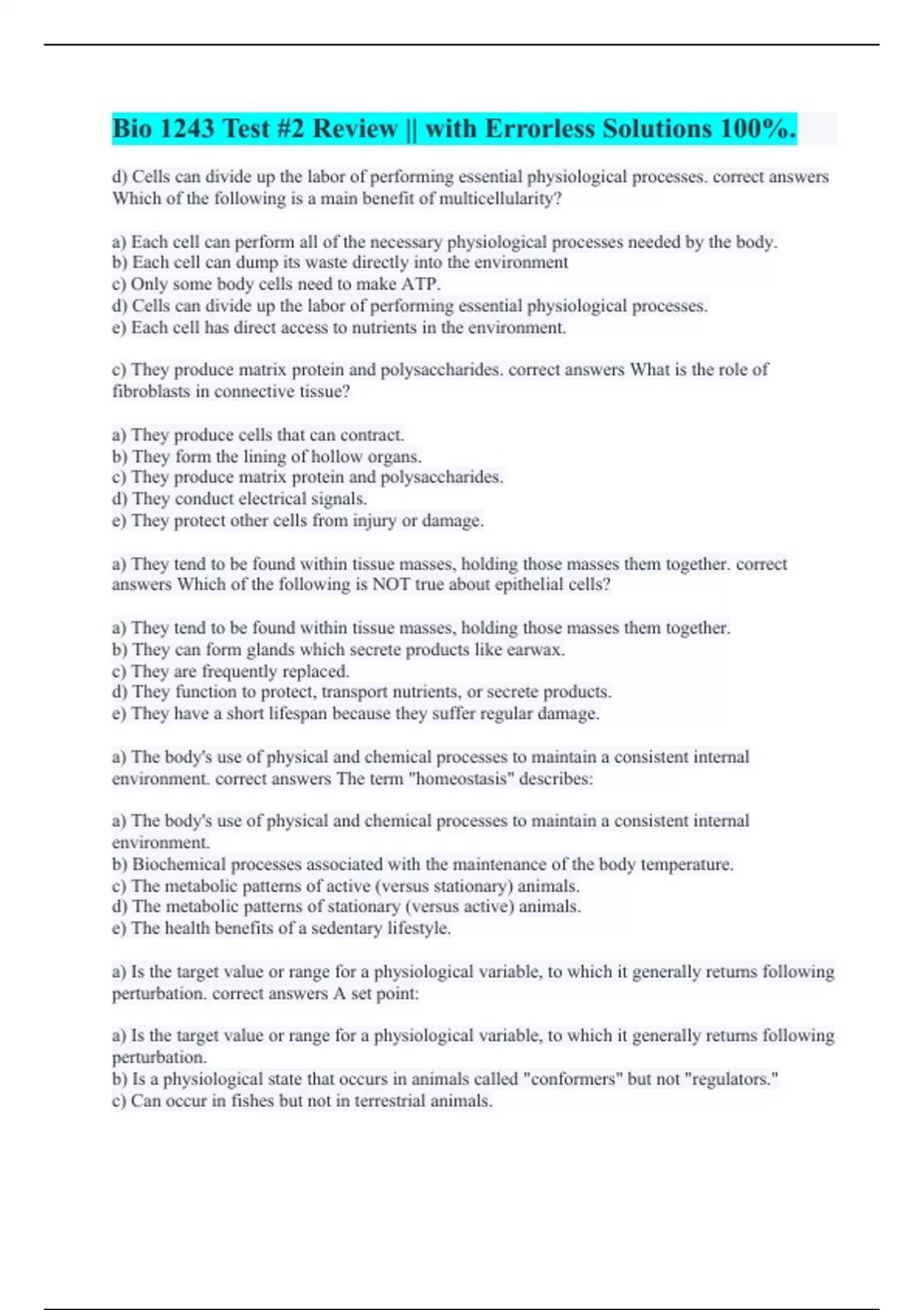 d) Cells can divide up the labor of performing essential physiological processes. correct answers Which of the following is a main benefit of multicellularity? a) Each cell can perform all of the necessary physiological processes needed by the body. b) Each cell can dump its waste directly into the environment c) Only some body cells need to make ATP. d) Cells can divide up the labor of performing essential physiological processes. e) Each cell has direct access to nutrients in the environment. c) They produce matrix protein and polysaccharides. correct answers What is the role of fibroblasts in connective tissue? a) They produce cells that can contract. b) They form the lining of hollow organs. c) They produce matrix protein and polysaccharides. d) They conduct electrical signals. e) They protect other cells from injury or damage. a) They tend to be found within tissue masses, holding those masses them together. correct answers Which of the following is NOT true about epithelial cells? a) They tend to be found within tissue masses, holding those masses them together. b) They can form glands which secrete products like earwax. c) They are frequently replaced. d) They function to protect, transport nutrients, or secrete products. e) They have a short lifespan because they suffer regular damage. a) The body's use of physical and chemical processes to maintain a consistent internal environment. correct answers The term "homeostasis" describes: a) The body's use of physical and chemical processes to maintain a consistent internal environment. b) Biochemical processes associated with the maintenance of the body temperature. c) The metabolic patterns of active (versus stationary) animals. d) The metabolic patterns of stationary (versus active) animals. e) The health benefits of a sedentary lifestyle. a) Is the target value or range for a physiological variable, to which it generally returns following perturbation. correct answers A set point: a) Is the target value or range for a physiological variable, to which it generally returns following perturbation. b) Is a physiological state that occurs in animals called "conformers" but not "regulators." c) Can occur in fishes but not in terrestrial animals.