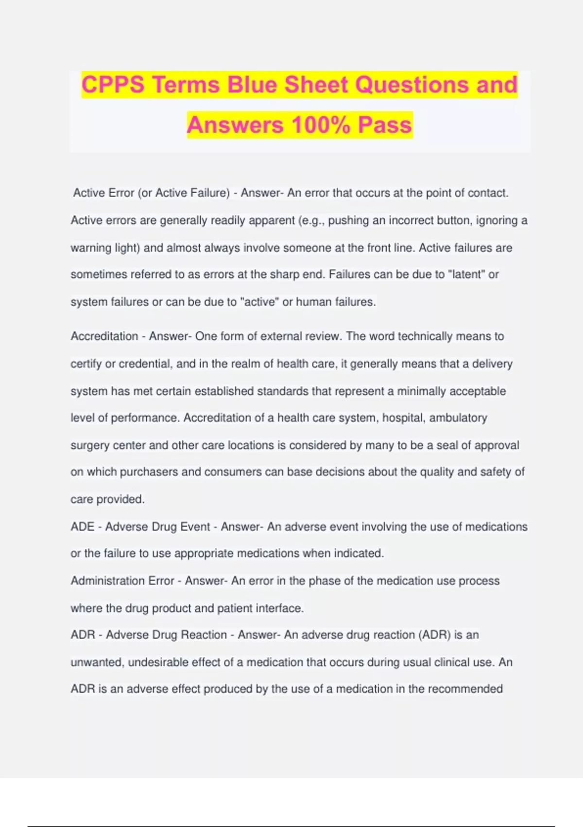 CPPS Terms Blue Sheet Questions and Answers 100% Pass Active Error (or Active Failure) - Answer- An error that occurs at the point of contact. Active errors are generally readily apparent (e.g., pushing an incorrect button, ignoring a warning light) and almost always involve someone at the front line. Active failures are sometimes referred to as errors at the sharp end. Failures can be due to "latent" or system failures or can be due to "active" or human failures. Accreditation - Answer- One form of external review. The word technically means to certify or credential, and in the realm of health care, it generally means that a delivery system has met certain established standards that represent a minimally acceptable level of performance. Accreditation of a health care system, hospital, ambulatory surgery center and other care locations is considered by many to be a seal of approval on which purchasers and consumers can base decisions about the quality and safety of care provided. ADE - Adverse Drug Event - Answer- An adverse event involving the use of medications or the failure to use appropriate medications when indicated. Administration Error - Answer- An error in the phase of the medication use process where the drug product and patient interface. ADR - Adverse Drug Reaction - Answer- An adverse drug reaction (ADR) is an unwanted, undesirable effect of a medication that occurs during usual clinical use. An ADR is an adverse effect produced by the use of a medication in the recommended manner and may range from "nuisance effects" (e.g. dry mouth with anticholinergic medications) to severe reactions, such as anaphylaxis to penicillin. ADR information is frequently provided by the Institute for Safe Medication Practices (ISMP) in cooperation with the FDA's MedWatch program. AE - Adverse Event - Answer- an event, preventable or unpreventable, that caused harm to a patient as a result of medical care. This includes never events; hospital- acquired conditions; events that required life- sustaining intervention; and events that caused prolonged hospital stays, permanent harm, or death. Any injury caused by medical care. An adverse event does not imply error, negligence or poor quality care, but indicates that an undesirable clinical outcome resulted from some aspect of diagnosis or therapy, not an underlying disease process. (also see Serious Adverse Event) AHRQ-Agency for Healthcare Research and Quality - Answer- The Agency for Healthcare Research and Quality is one of twelve agencies within the United States Department of Health and Human Services. It is the lead Federal agency charged with improving the safety and quality of America's health care system. AHRQ develops the knowledge, tools, and data needed to improve the health care system and help Americans, health care professionals, and policymakers make informed health decisions. Bar Code - Answer- Graphic representation of data (alpha, numeric, or both) that is machine readable; a method of encoding numbers or alphabetic characters using wide and narrow bars and spaces according to a set of rules called symbols. Scanning of a bar code gives instant access to information in an associated database. Benchmark - Answer- Healthcare benchmarking is taking an organization's performance metrics and comparing those to a standard developed using data from other similar organizations. The practice has been around in healthcare since roughly 1985. Leaders use benchmarking to learn where an organization is performing well against its peers, and where it needs improvement. In healthcare, a benchmark is the best in industry measurement that can drive improvement efforts to superior performance. Blunt End - Answer- The "blunt end" refers to the many layers of the health care system not in direct contact with patients, but which influence the personnel and equipment at the point of patient contact, the "sharp end". The blunt end refers to those who set policy, manage health care institutions, design medical devices, and other people and forces, which, though removed from direct patient care, affect how care is delivered. Call out - Answer- A call-out is a communication tactic used to related critical information during an emergent event. Critical information called out in these situations helps the team anticipate and prepare for vital next steps in patient care. It also benefits a recorder when present during a code or emergent event. One important aspect of a call-out is directing the information to a specific individual. Call-out technique is taught during TeamSTEPPS® training. Check-Back - Answer- A process of using closed-loop communication to ensure that information conveyed by the sender is understood by the re