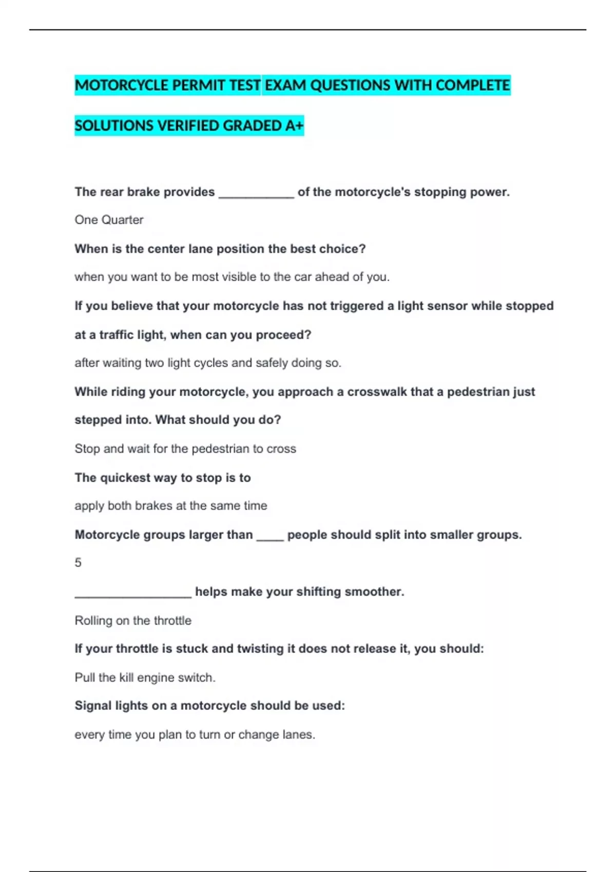 MOTORCYCLE PERMIT TEST EXAM QUESTIONS WITH COMPLETE SOLUTIONS VERIFIED GRADED A+ The rear brake provides ___________ of the motorcycle's stopping power. One Quarter When is the center lane position the best choice? when you want to be most visible to the car ahead of you. If you believe that your motorcycle has not triggered a light sensor while stopped at a traffic light, when can you proceed? after waiting two light cycles and safely doing so. While riding your motorcycle, you approach a crosswalk that a pedestrian just stepped into. What should you do? Stop and wait for the pedestrian to cross The quickest way to stop is to apply both brakes at the same time Motorcycle groups larger than ____ people should split into smaller groups. 5 _________________ helps make your shifting smoother. Rolling on the throttle If your throttle is stuck and twisting it does not release it, you should: Pull the kill engine switch. Signal lights on a motorcycle should be used: every time you plan to turn or change lanes. If you are about to collide with an object and you wish to get the motorcycle to lean quickly to the right, you should: push the inside of the right handle grip Rolling on the throttle through a turn will help stabilize the motorcycle if a vehicle enters your path, you should: Move away from the vehicle When making a normal turn, should the motorcycle rider lean? Yes the motorcyclist should lean with the motorcycle To stop as quick as possible, you should: Use both brakes at the same time Riding with both legs on the same side of the motorcycle is: never permitted Because riding a motorcycle is more tiring than driving a car, you should: Take frequent breaks By leaving a minimum of ____ seconds between yourself and the vehicle in front of you, you ensure you have enough stopping distance. 2 Maximum straight line braking is achieved by: applying both breaks without the wheels locking Before each motorcycle ride, you should adjust: side mirrors Why is maintaining a space cushion important?