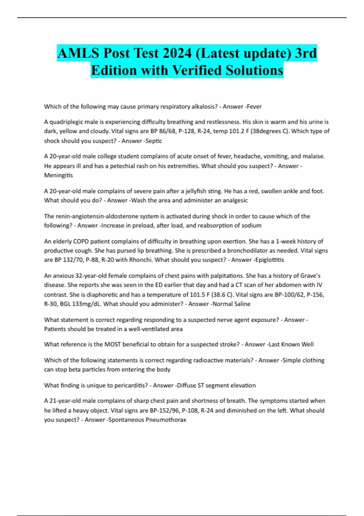 AMLS Post Test 2024 (Latest update) 3rd Edition with Verified Solutions Which of the following may cause primary respiratory alkalosis? - Answer -Fever A quadriplegic male is experiencing difficulty breathing and restlessness. His skin is warm and his urine is dark, yellow and cloudy. Vital signs are BP 86/68, P-128, R-24, temp 101.2 F (38degrees C). Which type of shock should you suspect? - Answer -Septic A 20-year-old male college student complains of acute onset of fever, headache, vomiting, and malaise. He appears ill and has a petechial rash on his extremities. What should you suspect? - Answer - Meningitis A 20-year-old male complains of severe pain after a jellyfish sting. He has a red, swollen ankle and foot. What should you do? - Answer -Wash the area and administer an analgesic The renin-angiotensin-aldosterone system is activated during shock in order to cause which of the following? - Answer -Increase in preload, after load, and reabsorption of sodium An elderly COPD patient complains of difficulty in breathing upon exertion. She has a 1-week history of productive cough. She has pursed lip breathing. She is prescribed a bronchodilator as needed. Vital signs are BP 132/70, P-88, R-20 with Rhonchi. What should you suspect? - Answer -Epiglottitis An anxious 32-year-old female complains of chest pains with palpitations. She has a history of Grave's disease. She reports she was seen in the ED earlier that day and had a CT scan of her abdomen with IV contrast. She is diaphoretic and has a temperature of 101.5 F (38.6 C). Vital signs are BP-100/62, P-156, R-30, BGL 133mg/dL. What should you administer? - Answer -Normal Saline What statement is correct regarding responding to a suspected nerve agent exposure? - Answer - Patients should be treated in a well-ventilated area What reference is the MOST beneficial to obtain for a suspected stroke? - Answer -Last Known Well Which of the following statements is correct regarding radioactive materials? - Answer -Simple clothing can stop beta particles from entering the body What finding is unique to pericarditis? - Answer -Diffuse ST segment elevation A 21-year-old male complains of sharp chest pain and shortness of breath. The symptoms started when he lifted a heavy object. Vital signs are BP-152/96, P-108, R-24 and diminished on the left. What should you suspect? - Answer -Sp