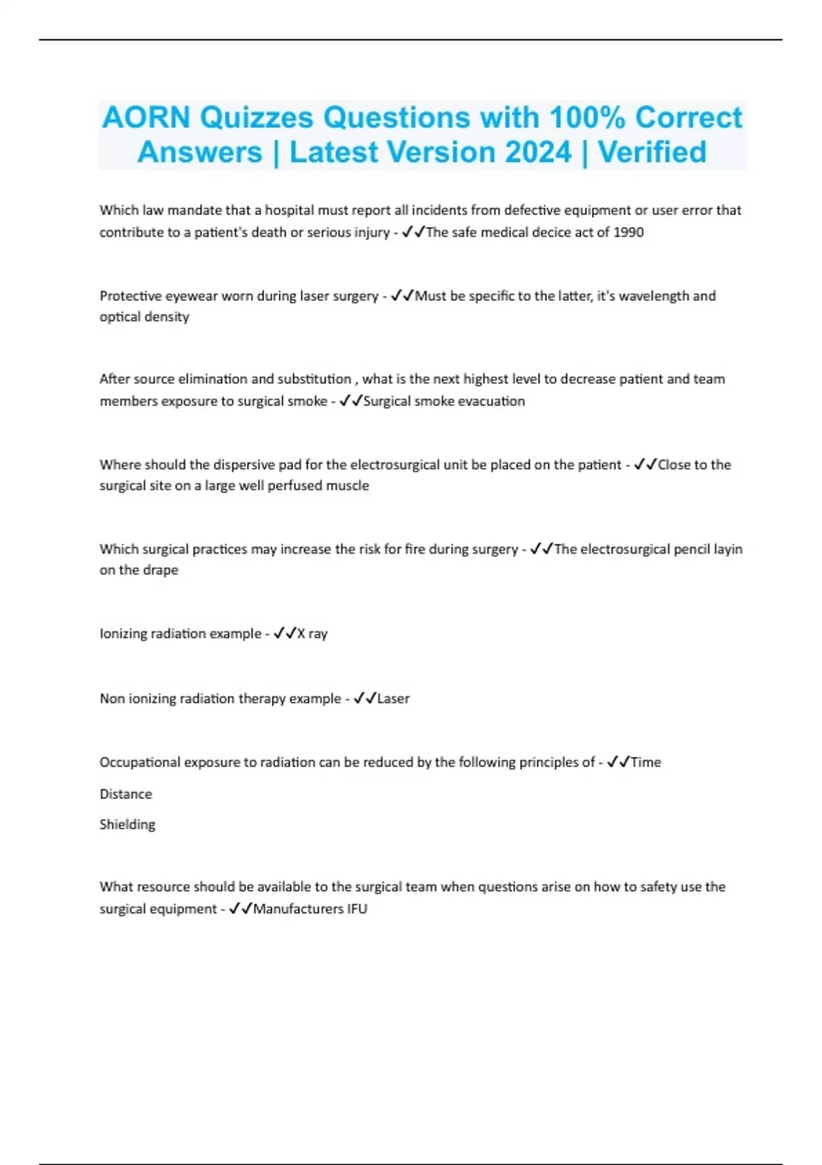 AORN Quizzes Questions with 100% Correct Answers | Latest Version 2024 | Verified
