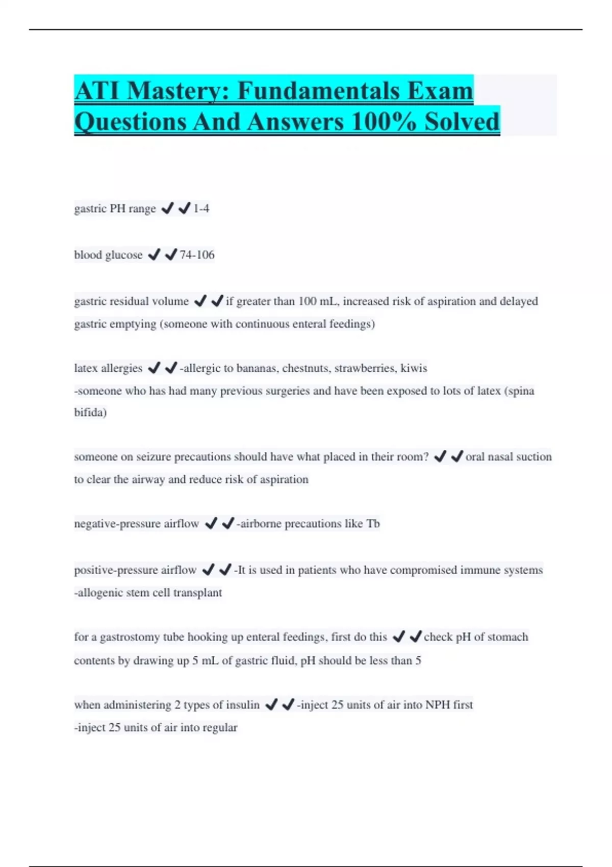 ATI Mastery: Fundamentals Exam Questions And Answers 100% Solved gastric PH range ️️1-4 blood glucose ️️74-106 gastric residual volume ️️if greater than 100 mL, increased risk of aspiration and delayed gastric emptying (someone with continuous enteral feedings) latex allergies ️️-allergic to bananas, chestnuts, strawberries, kiwis -someone who has had many previous surgeries and have been exposed to lots of latex (spina bifida) someone on seizure precautions should have what placed in their room? ️️oral nasal suction to clear the airway and reduce risk of aspiration negative-pressure airflow ️️-airborne precautions like Tb positive-pressure airflow ️️-It is used in patients who have compromised immune systems -allogenic stem cell transplant for a gastrostomy tube hooking up enteral feedings, first do this ️️check pH of stomach contents by drawing up 5 mL of gastric fluid, pH should be less than 5 when administering 2 types of insulin ️️-inject 25 units of air into NPH first -inject 25 units of air into regular